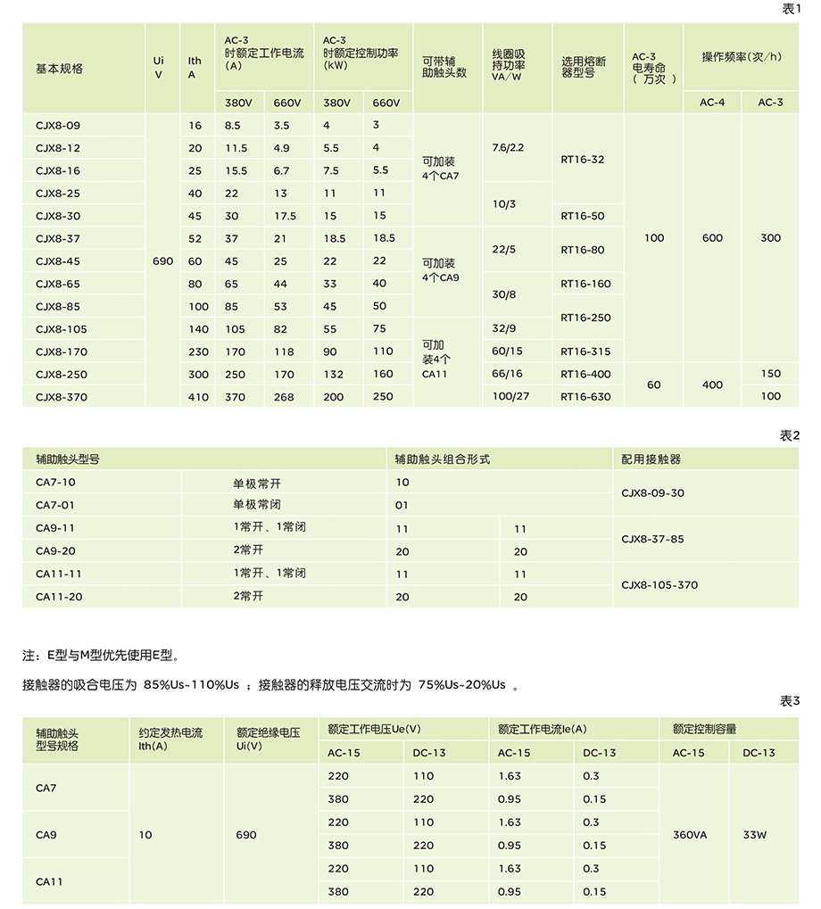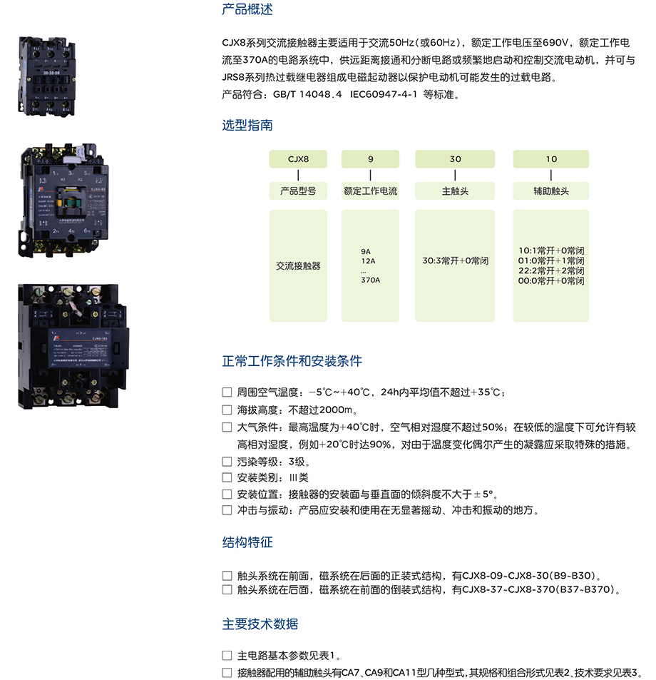 CJX8系列交流接触器主要适用于交流50Hz(或60Hz),额定工作电压至690V,额定工作电流至370A的电路系统中,供远距离接通和分断电路或频繁地启动和控制交流电动机,并可与JRS8系列热过载继电器组成电磁起动器以保护电动机可能发生的过载电路。