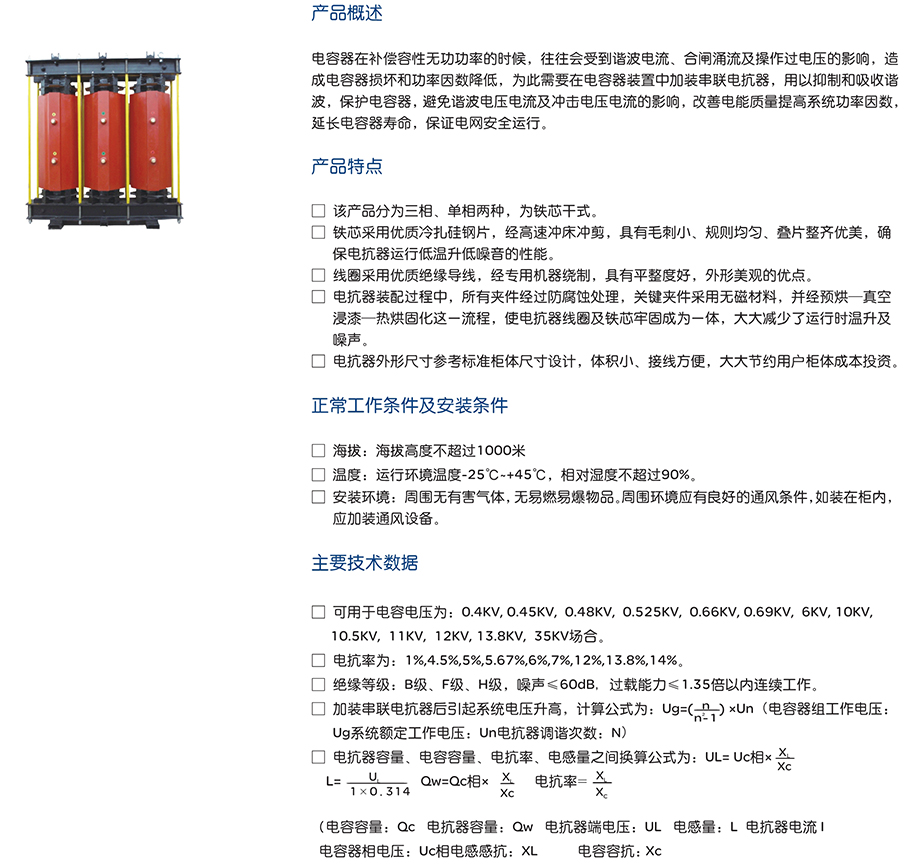 电容器在补偿容性无功功率的时候,往往会受到谐波电流、合闸涌流及操作过电压的影响,造成电容器损坏和功率因数降低,为此需要在电容器装置中加装串联电抗器,用以抑制和吸收谐波,保护电容器,避免谐波电压电流及冲击电压电流的影响,改善电能质量提高系统功率因数,延长电容器寿命,保证电网安全运行。