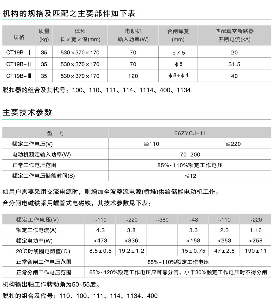 | CT19B CT19型弹簧操动机构可供操动ZN28系列分装式高压真空断路器及其合闸功与之相当的其它类型的真空断路器,本产品的机械寿命为10000次。 机构合闸弹簧的储能方式有电动机储能和手动储能两种;分闸操作有分闸电磁铁、过电流脱扣电磁铁及手动按钮操作三种;合闸操作有合闸电磁铁及手动按钮操作两种。 |