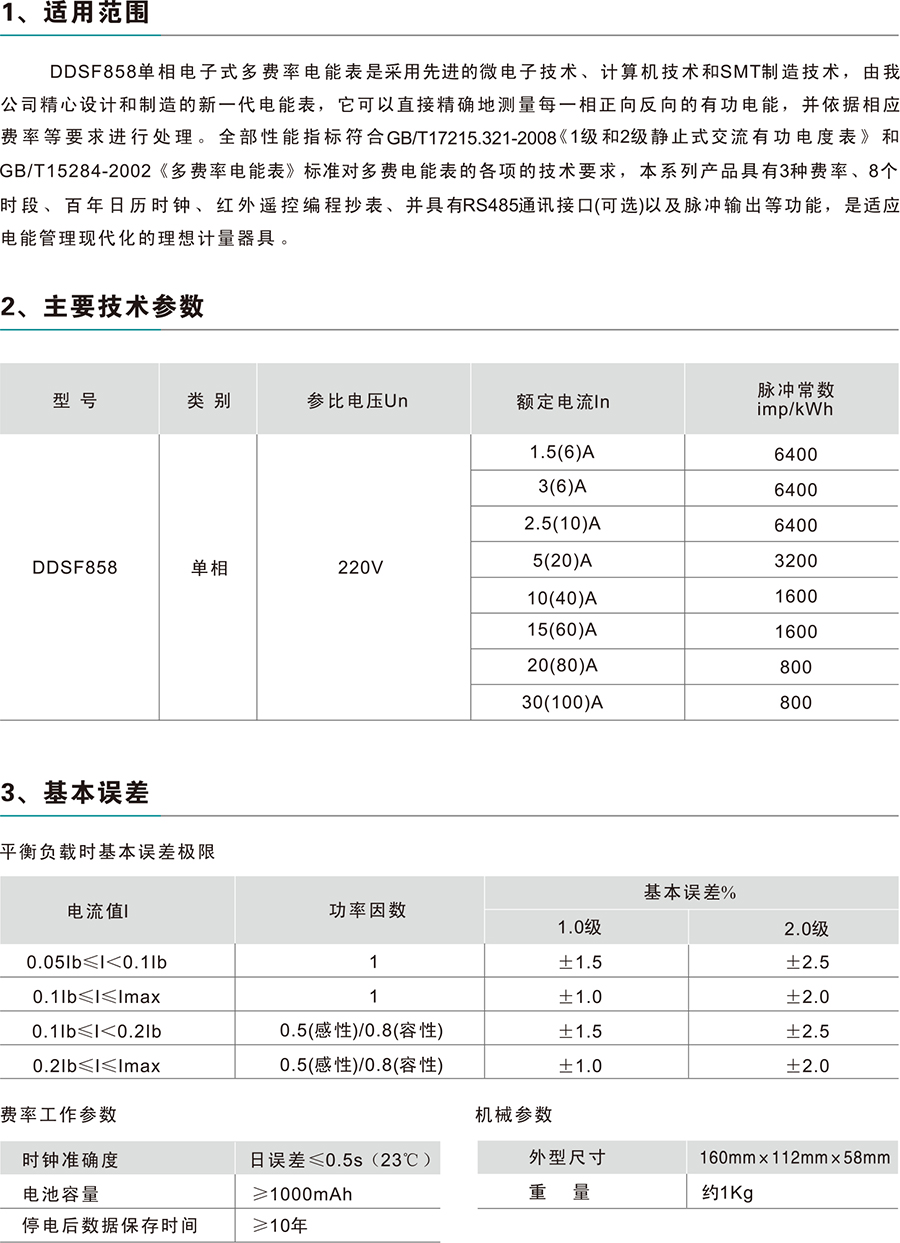 DDSF858单相电子式多费率电能表是采用先进的微电子技术、计算机技术和SMT制造技术,设计和制造的新一代电能表,它可以直接精确地测量每一相正向反向的有功电能,并依据相应费率等要求进行处理。全部性能指标符合《1级和2级静止式交流有功电度表》和《多费率电能表》标准对多费电能表的各项的技术要求,本系列产品具有3种费率、8个时段、百年日历时钟、红外遥控编程抄表、并具有RS485通讯接口(可选)以及脉冲输出等功能,是适应电能管理现代化的理想计量器具。