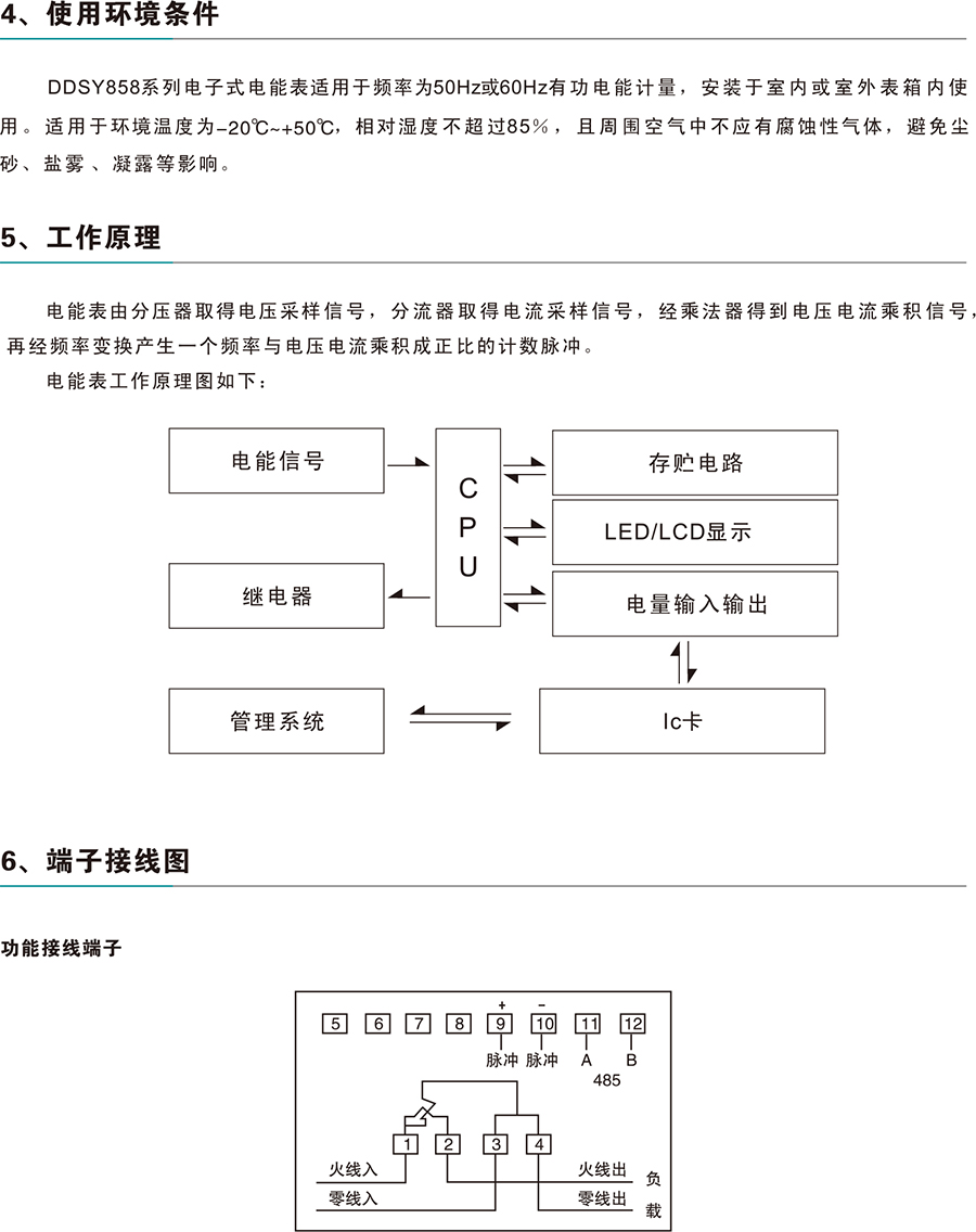 DDSY858单相电子式预付费电能表(下称电表)采用微电子技术计量电能,采用全屏蔽、全密封结构,用先进的单片机处理系统进行数据的采集、处理和保存,具有良好的抗电磁干扰、低自耗节电、高精度不需校表、防窃电、高过载、长寿命的特点。