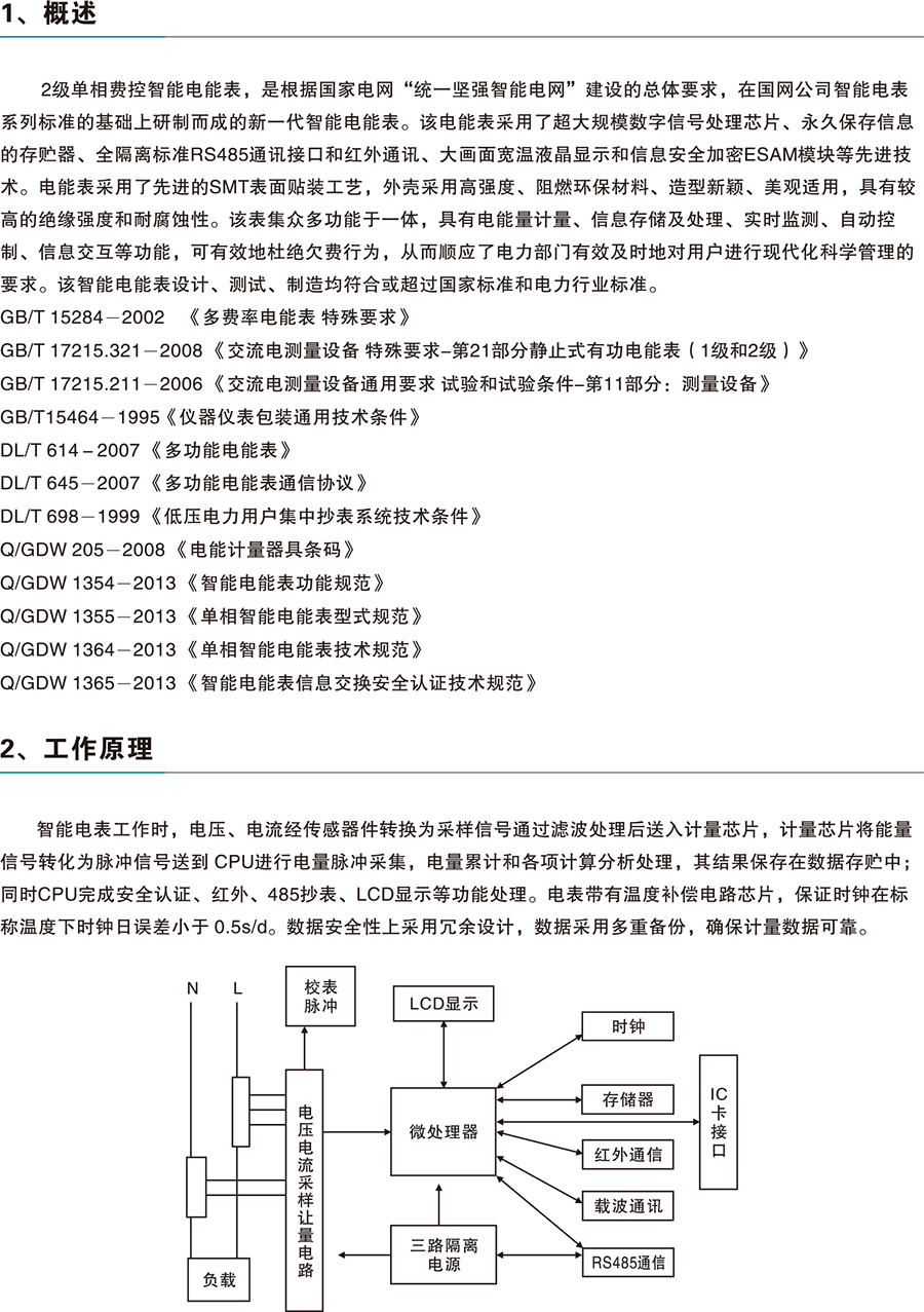 2级单相费控智能电能表,是根据国家电网“统一坚强智能电网”建设的总体要求,在国网公司智能电表系列标准的基础上研制而成的新一代智能电能表。该电能表采用了大规模数字信号处理芯片、永久保存信息的存贮器、全隔离标准RS485通讯接口和红外通讯、大画面宽温液晶显示和信息安全加密ESAM模块等先进技术。电能表采用了先进的SMT表面贴装工艺,外壳采用高强度、阻燃环保材料、造型新颖、美观适用,具有较高的绝缘强度和耐腐蚀性。该表集众多功能于一体,具有电能量计量、信息存储及处理、实时监测、自动控制、信息交互等功能,可有效地杜绝欠费行为,从而顺应了电力部门有效及时地对用户进行现代化科学管理的要求。