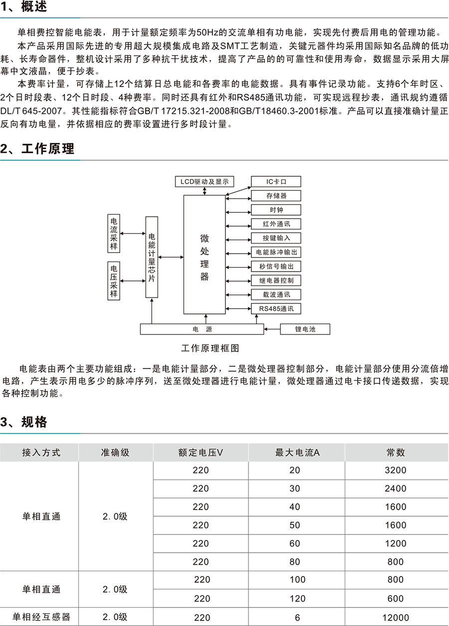 2个日时段表、12个日时段、4种费率。同时还具有红外和RS485通讯功能,可实现远程抄表,通讯规约遵循DL/T645-2007。产品可以直接准确计量正反向有功电量,并依据相应的费率设置进行多时段计量。