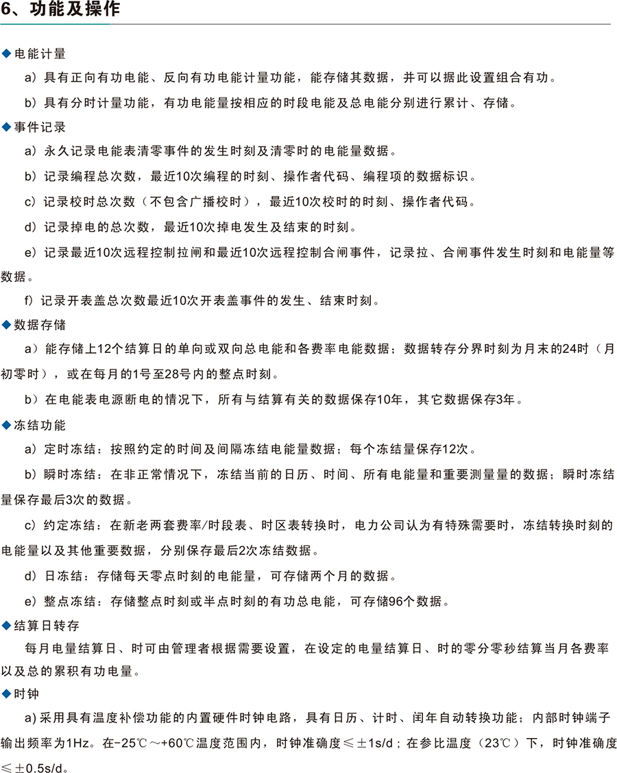 本费率计量,可存储上12个结算日总电能和各费率的电能数据。具有事件记录功能。支持6个年时区、