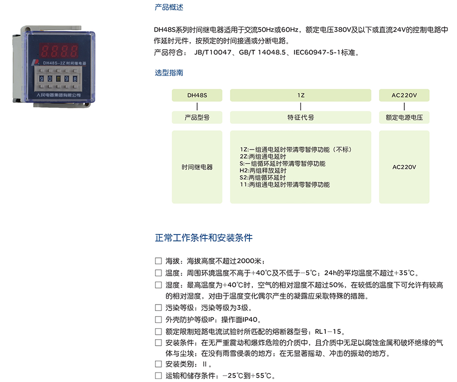 DH48S系列时间继电器适用于交流50Hz或60Hz,额定电压380V及以下或直流24V的控制电路中作延时元件,按预定的时间接通或分断电路。