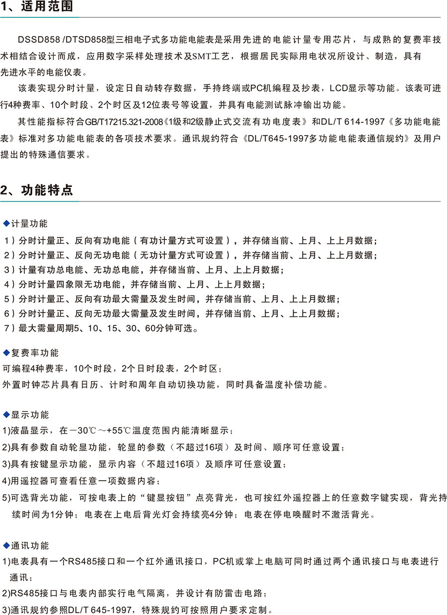 DSSD858/DTSD858型三相电子式多功能电能表是采用先进的电能计量专用芯片,与成熟的复费率技术相结合设计而成,应用数字采样处理技术及SMT工艺,根据居民实际用电状况所设计、制造的电能仪表。
