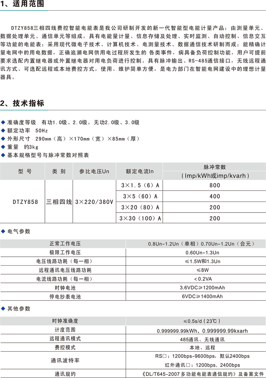 DTZY858三相四线费控智能电能表是新一代智能型电能计量产品:由测量单元、数据处理单元、通信单元等组成,具有电能量计量、信息存储及处理、实时监测、自动控制、信息交互等功能的电能表;采用现代微电子技术、计算机技术、电测量技术、数据通信技术研制而成;能精确计量电网中的用电数据,正确追溯电网供用电过程所发生的各类事件,病具备负荷控制功能,用户可提前要求选配内置继电器或外置继电器对用电负荷进行控制。具有脉冲输出、RS-485通信接口,无线远程通讯方式、可选配远程或本地费控方式,使用、维护简单方便,是电力部门在智能电网建设中的理想计量器具。