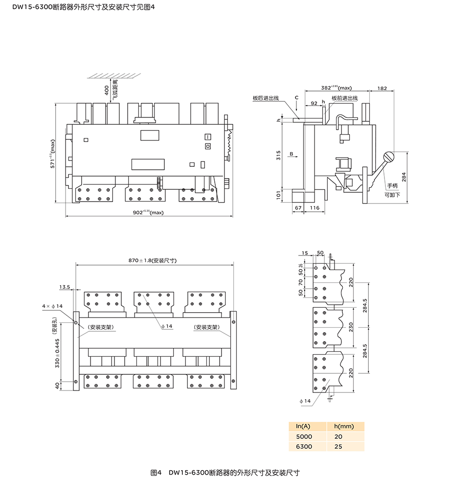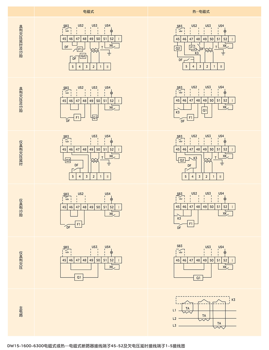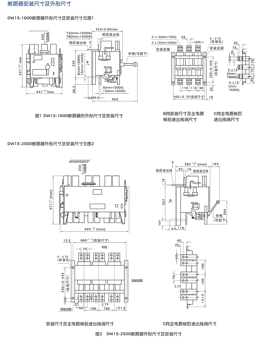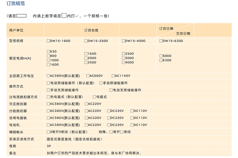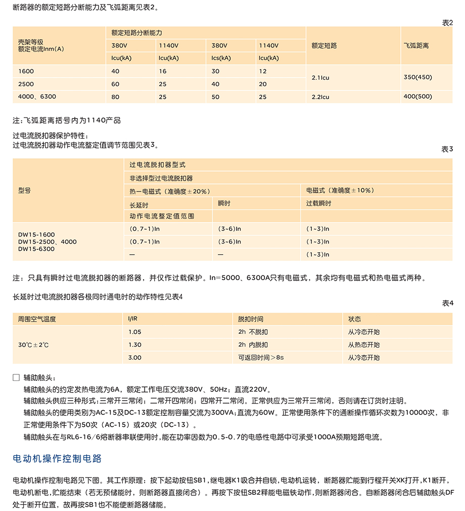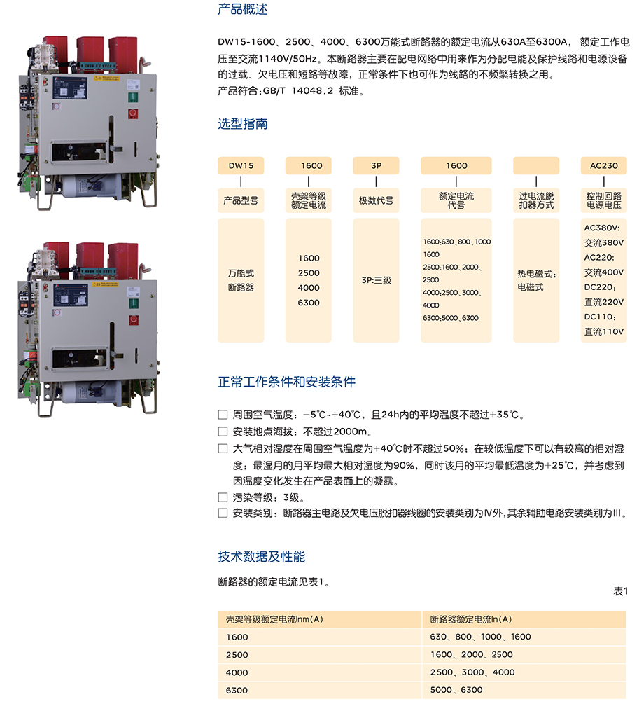 DW15-1600、2500、4000、6300万能式断路器的额定电流从630A至6300A, 额定工作电