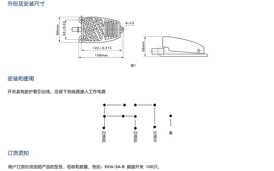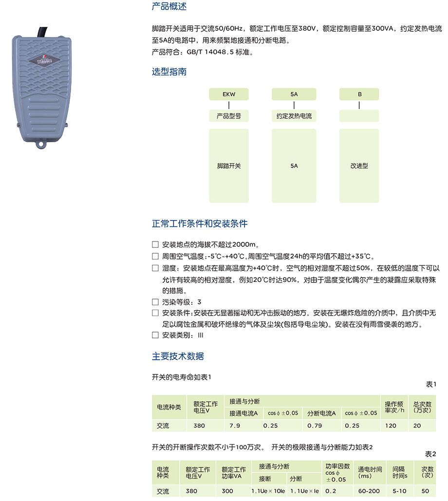 脚踏开关适用于交流50/60Hz,额定工作电压至380V,额定控制容量至300VA,约定发热电流至5A的电路中,用来频繁地接通和分断电路。