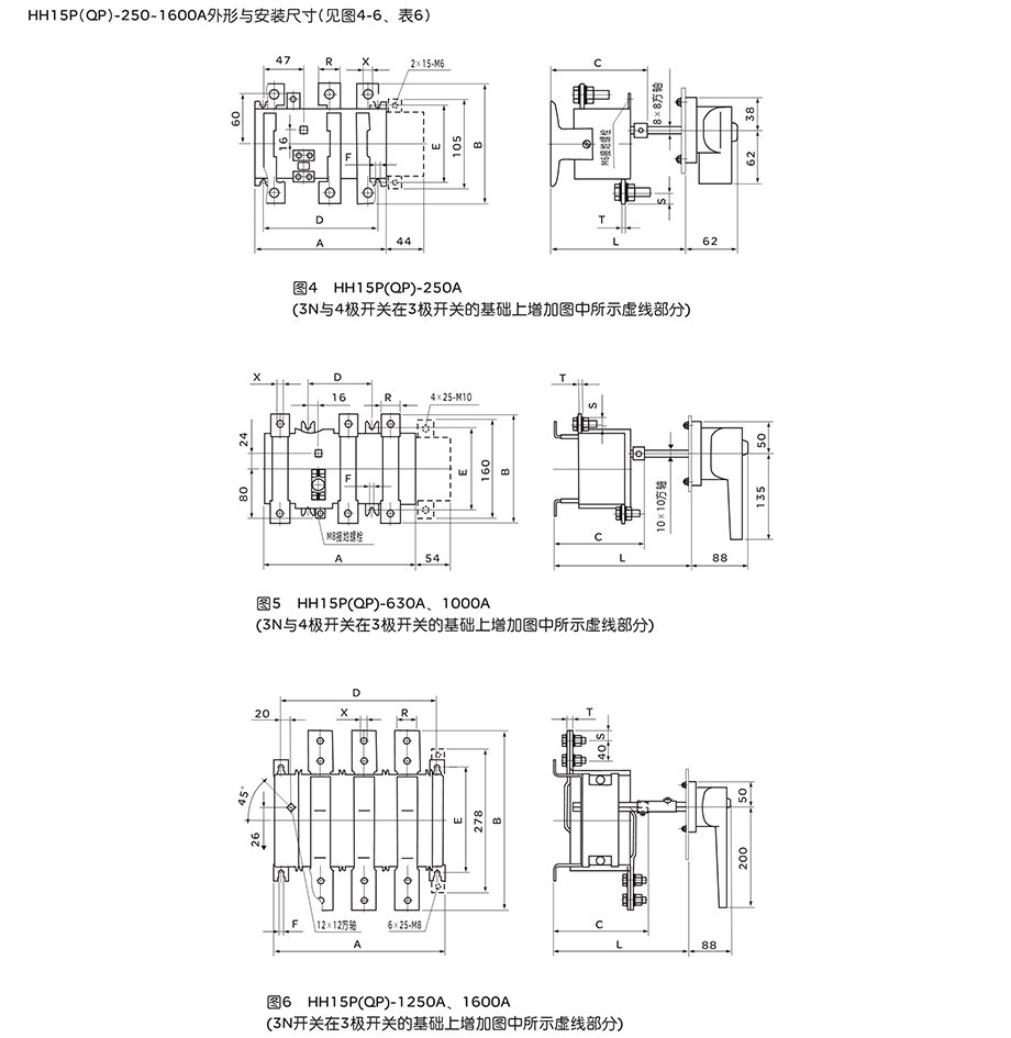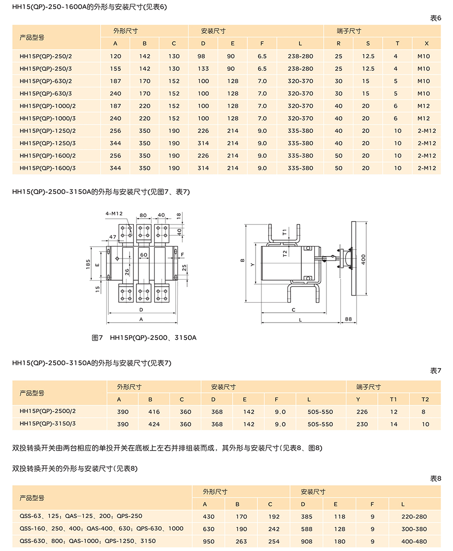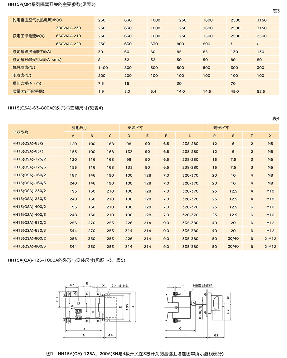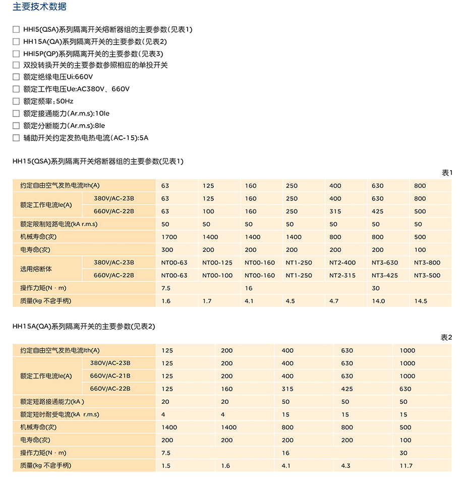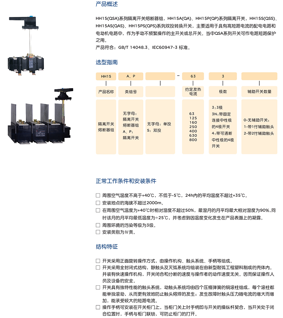 HH15(QSA)系列隔离开关熔断器组,HH15A(QA)、HH15P(QP)系列隔离开关,HH15s(QSS)、HH15AS(QAS)、HH15PS(QPS)系列双投转换开关,主要适用于具有高短路电流的配电电路和电动机电路中,作为手动不频繁操作的主开关或总开关。当中QSA系列开关可作电路短路保护之用。