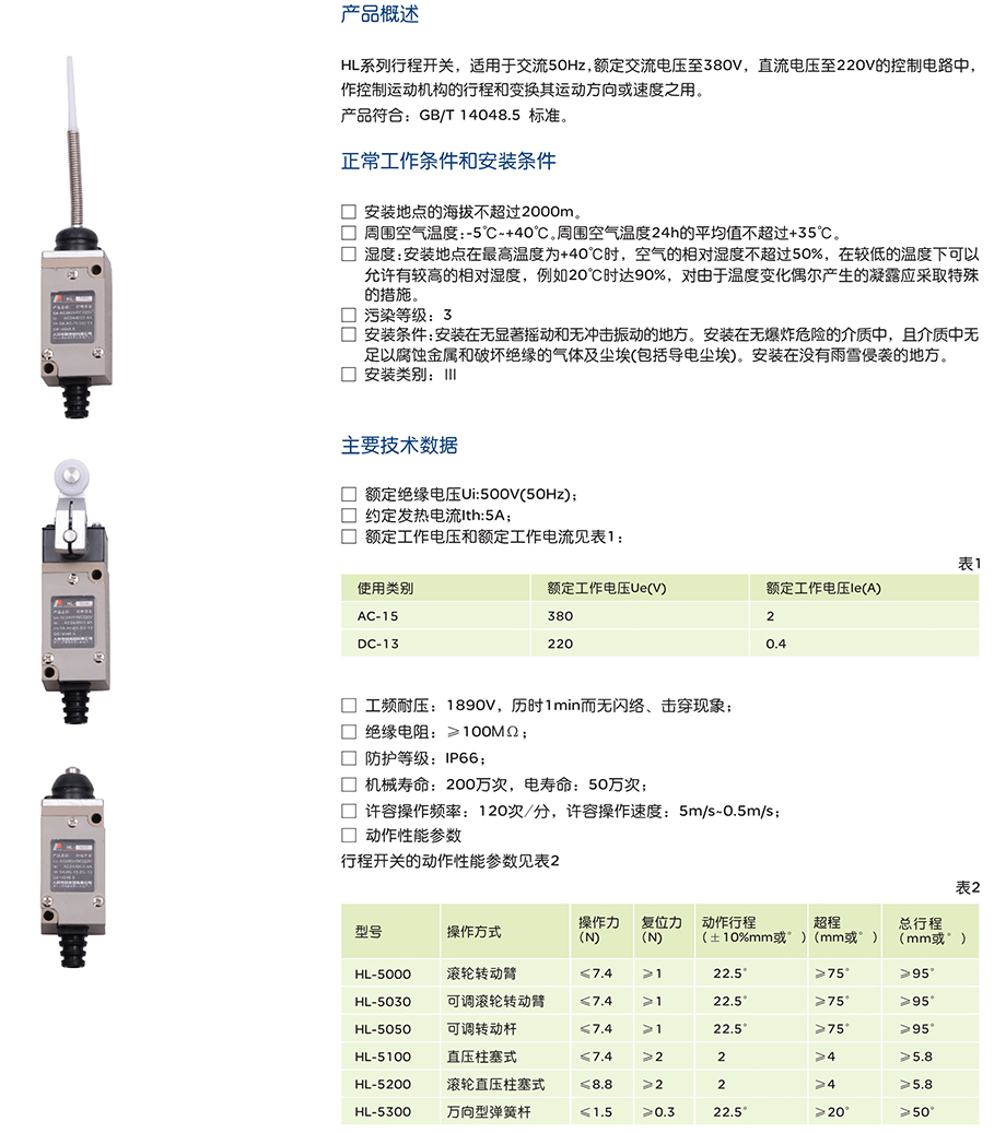 HL系列行程开关,适用于交流50Hz,额定交流电压至380V,直流电压至220V的控制电路中,作控制运动机构的行程和变换其运动方向或速度之用。