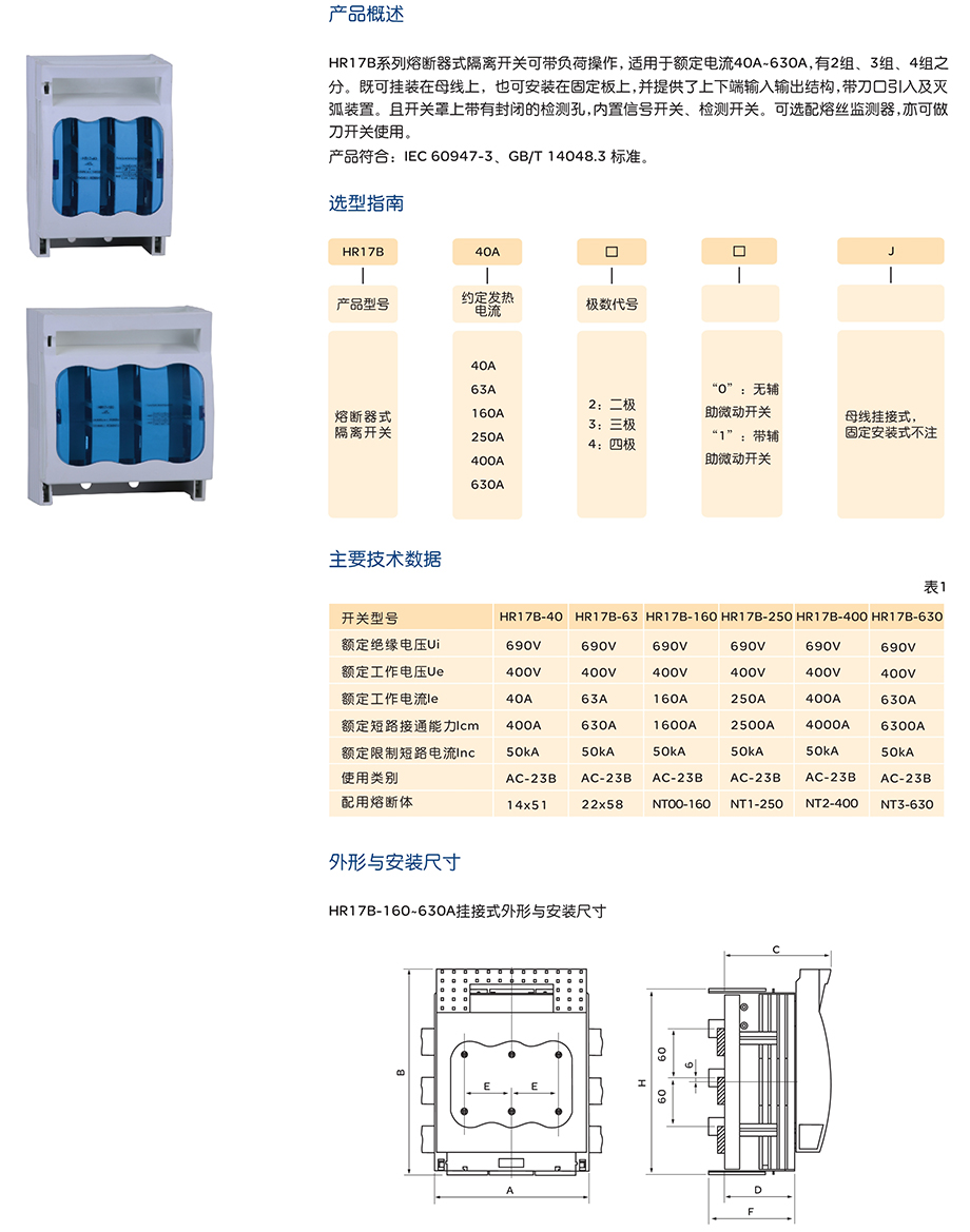 HR178系列熔断器式隔离开关可带负荷操作,适用于额定电流40A-630A,有2组、3组、4组之分。既可挂装在母线上,也可安装在固定板上,并提供了上下端输入输出结构,带刀口引入及灭弧装置。且开关罩上带有封闭的检测孔,内置信号开关、检测开关。可选配熔丝监测器,亦可做刀开关使用。