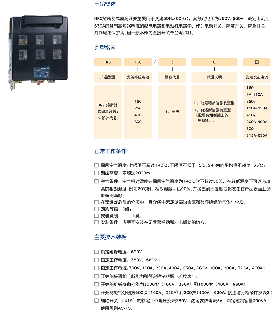 HR5熔断器式隔离开关主要用于交流50Hz(60Hz),其额定电压为380V/660V,额定电流至630A的具有高短路电流的配电电路和电动机电路中,作为电源开关、隔离开关、应急开关、并作电路保护用,但一般不作为直接开关单台电动机。