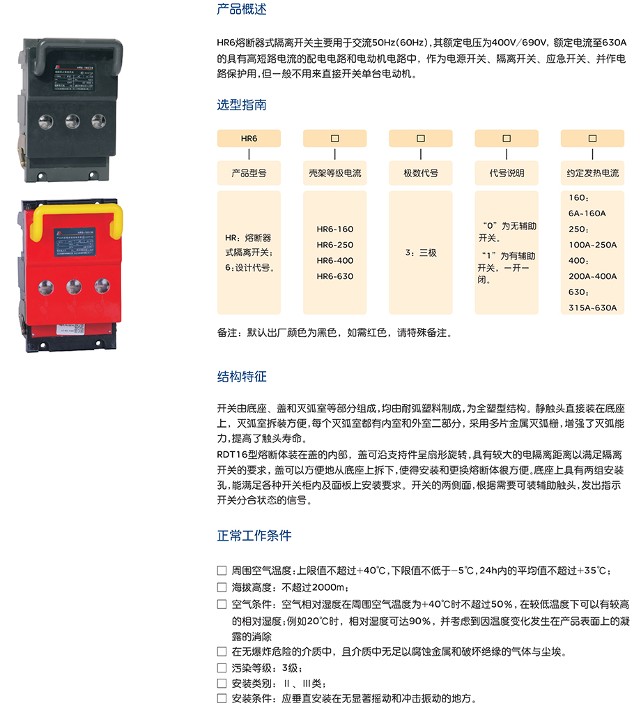 HR6熔断器式隔离开关主要用于交流50Hz(60Hz),其额定电压为400V/690V,额定电流至630A的具有高短路电流的配电电路和电动机电路中,作为电源开关、隔离开关、应急开关、并作电路保护用,但一般不用来直接开关单台电动机。