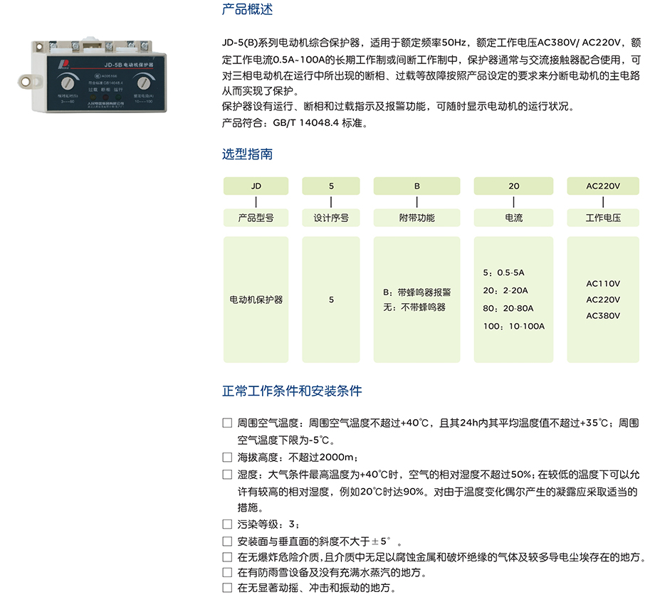 J0-5(8)系列电动机综合保护器,适用于额定频率50Hz,额定工作电压AC380V/AC220V,额定工作电流0.5A-100A的长期工作制或间断工作制中,保护器通常与交流接触器配合使用,可对三相电动机在运行中所出现的断相、过载等故障按照产品设定的要求来分断电动机的主电路从而实现了保护。
