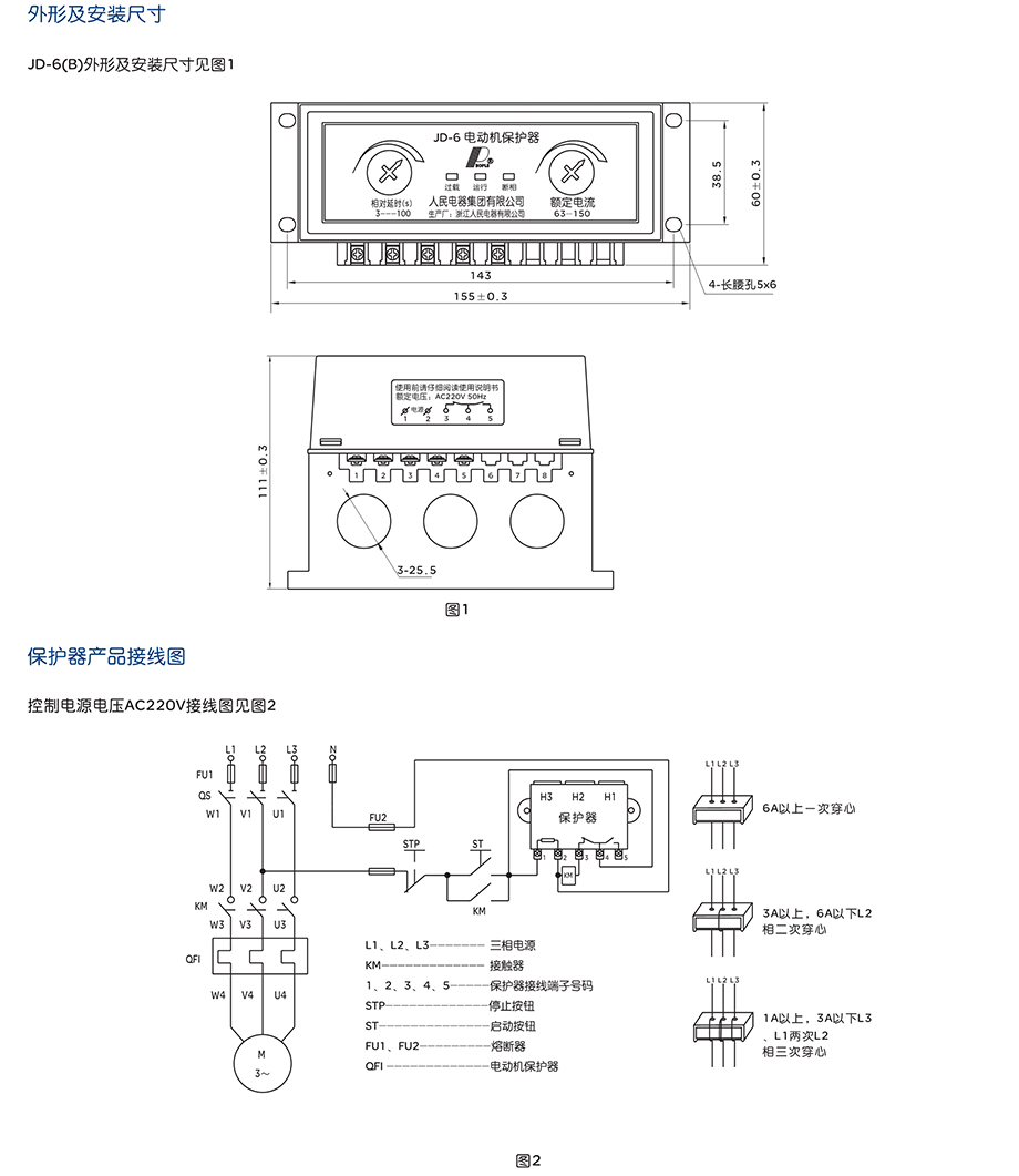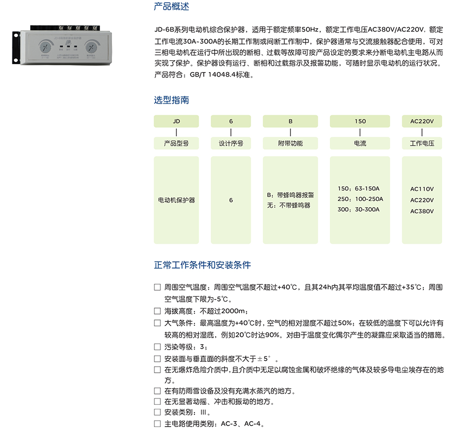 JD-6B系列电动机综合保护器,适用于额定频率50Hz,额定工作电压AC380V/AC220V,额定工作电流30A-300A的长期工作制或间断工作制中,保护器通常与交流接触器配合使用,可对三相电动机在运行中所出现的断相、过载等故障可按产品设定的要求来分断电动机主电路从而实现了保护。保护器设有运行、断相和过载指示及报警功能,可随时显示电动机的运行状况。