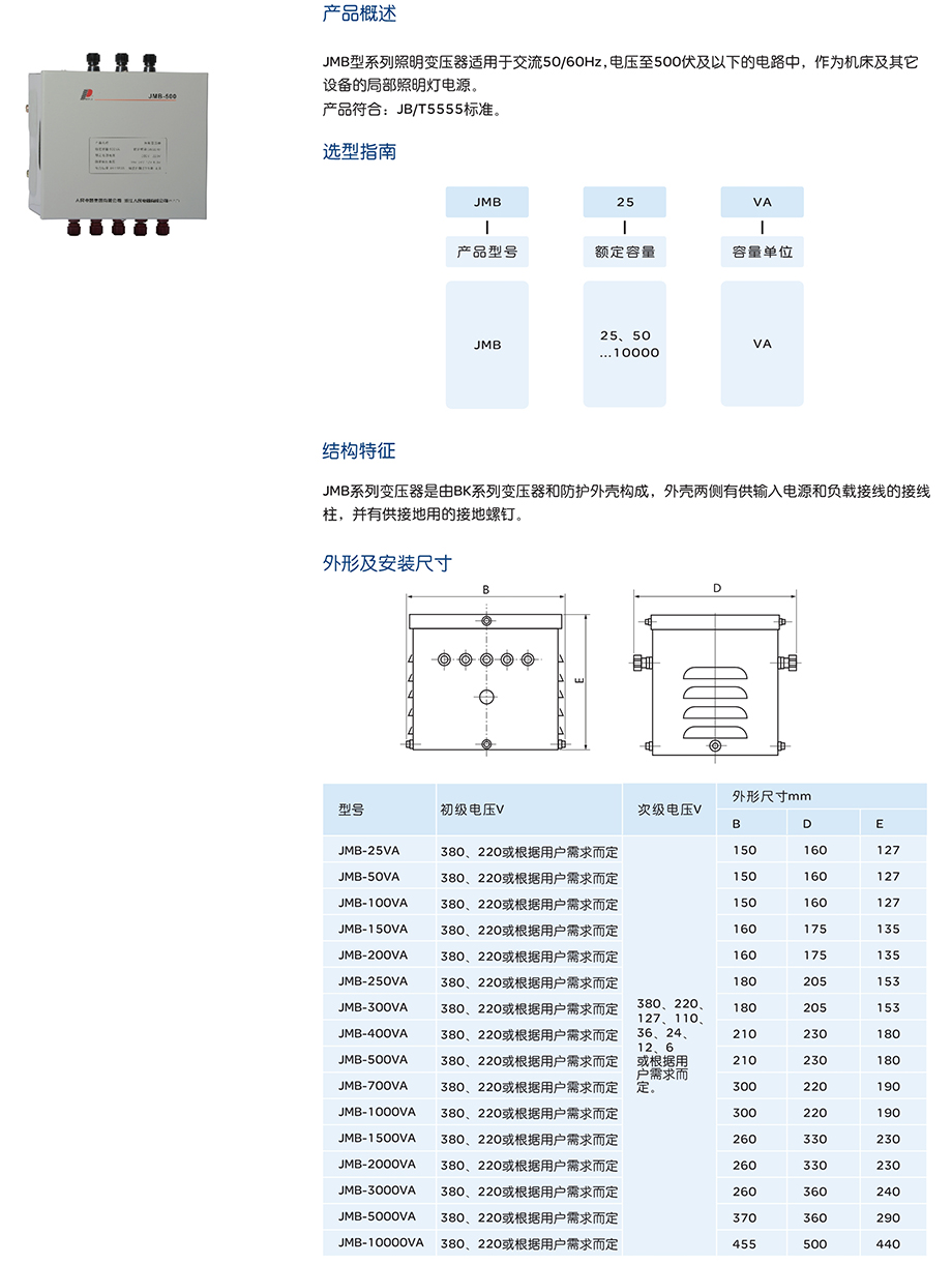 JMB型系列照明变压器适用于交流50/60Hz,电压至500伏及以下的电路中,作为机床及其它设备的局部照明灯电源。
