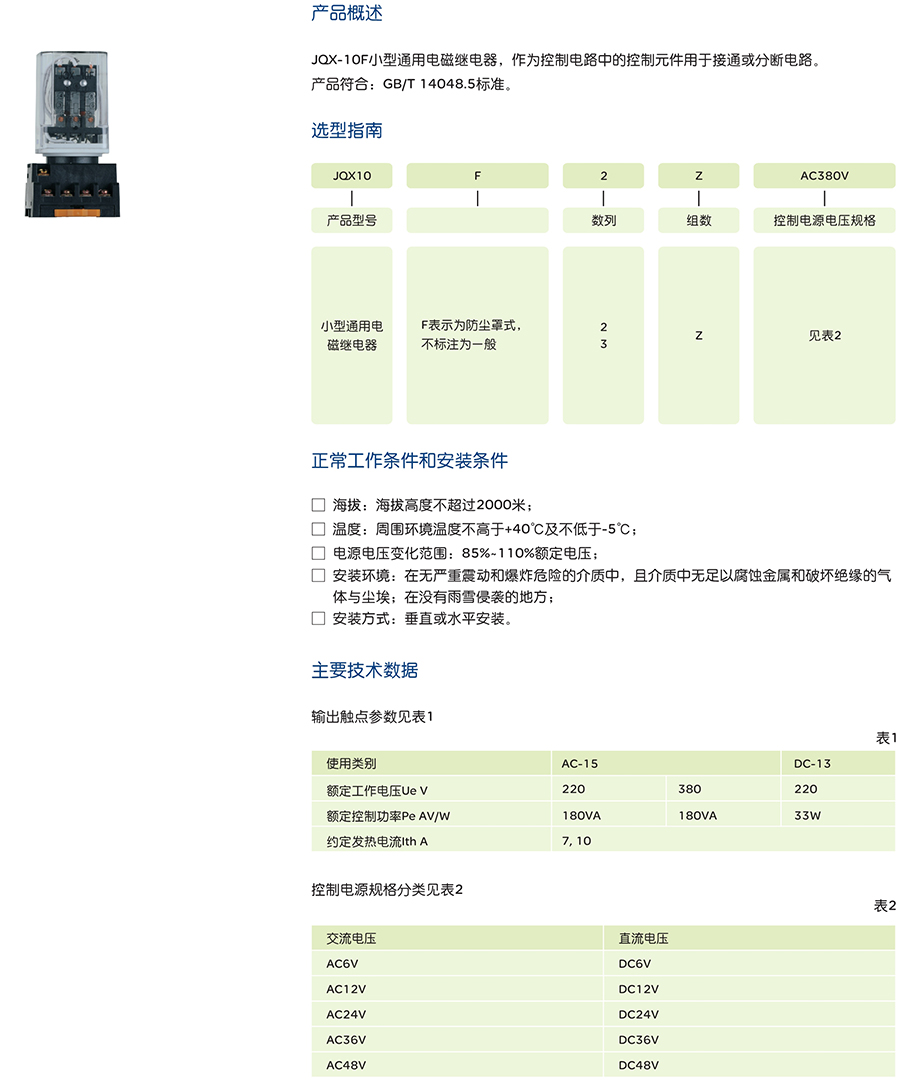 JQX-10F小型通用电磁继电器,作为控制电路中的控制元件用于接通或分断电路。