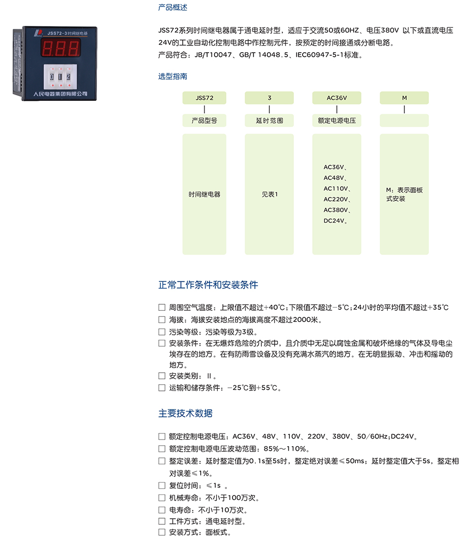 JSS72系列时间继电器属于通电延时型,适应于交流50或60HZ、电压380V以下或直流电压24V的工业自动化控制电路中作控制元件,按预定的时间接通或分断电路。