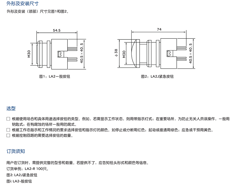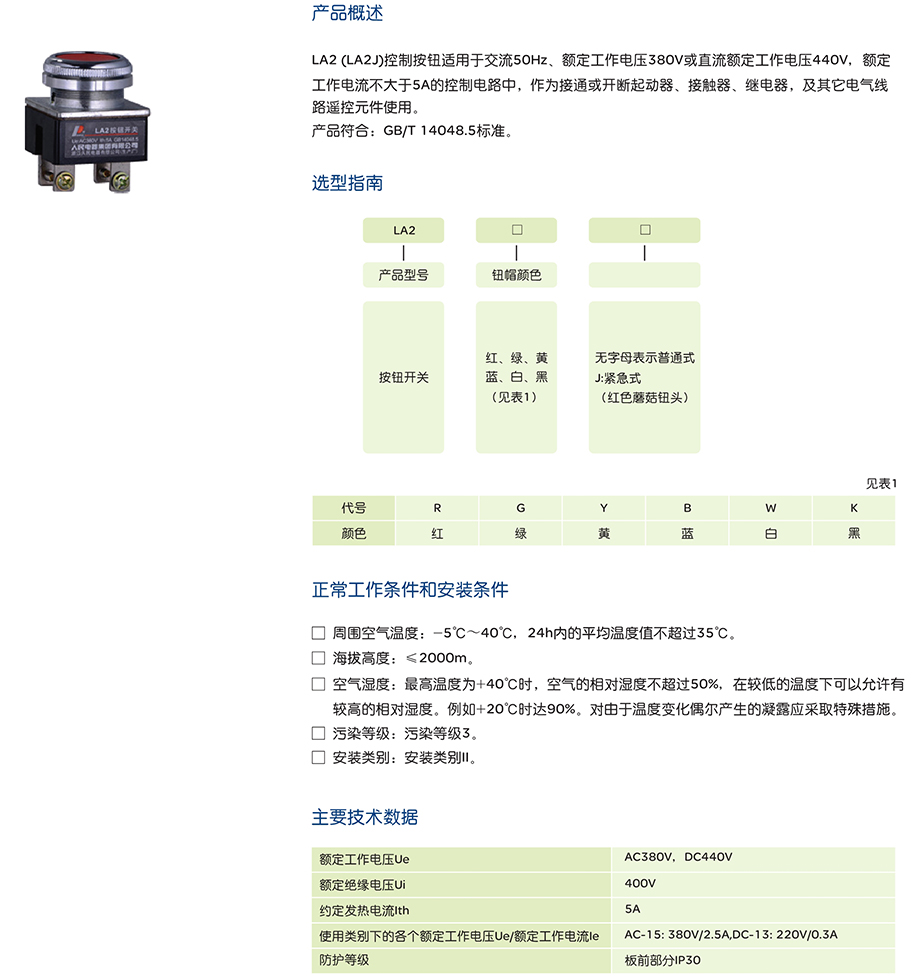 LA2(LA2J)控制按钮适用于交流50Hz、额定工作电压380V或直流额定工作电压440V,额定工作电流不大于5A的控制电路中,作为接通或开断起动器、接触器、继电器,及其它电气线路遥控元件使用。