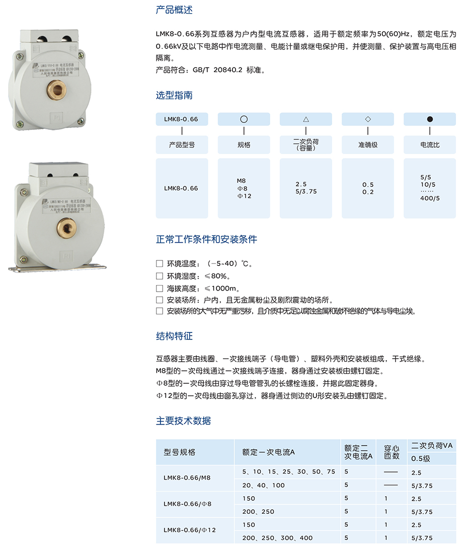 LMK8-0.66系列互感器为户内型电流互感器,适用于额定频率为50(60)Hz,额定电压为0.66kV及以下电路中作电流测量、电能计量或继电保护用,并使测量、保护装置与高电压相隔离。