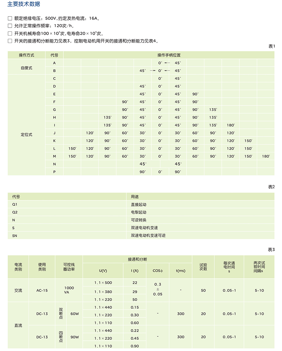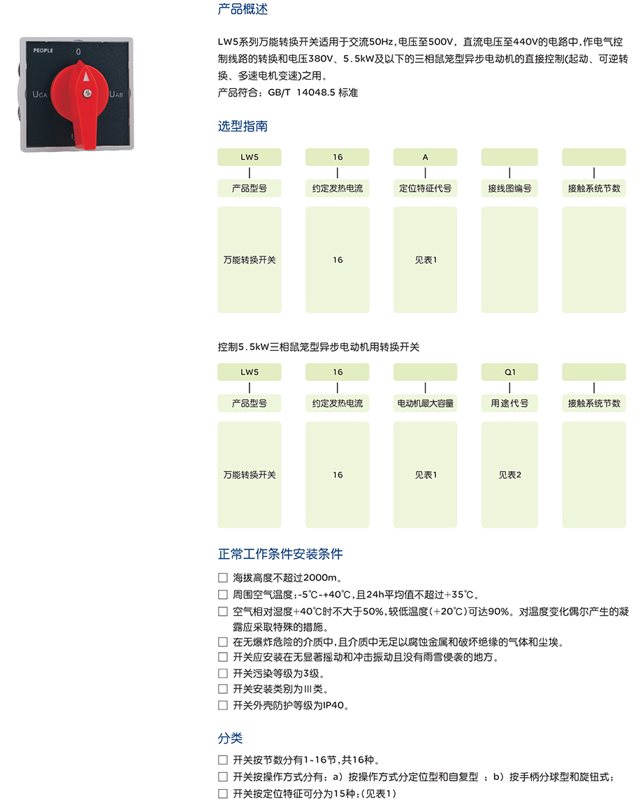 LW5系列万能转换开关适用于交流50Hz,电压至500V,直流电压至440V的电路中,作电气控制线路的转换和电压380V、5.5kW及以下的三相鼠笼型异步电动机的直接控制(起动、可逆转换、多速电机变速)之用。