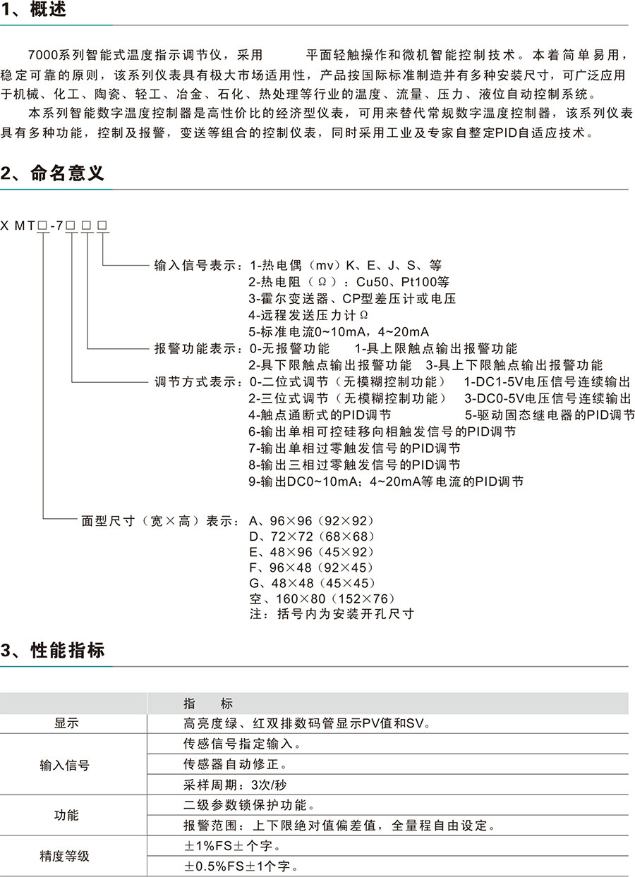 7000系列智能式温度指示调节仪,采用平面轻触操作和微机智能控制技术。本着简单易用,稳定可靠的原则,该系列仪表具有很大市场适用性,产品按标准制造并有多种安装尺寸,可广泛应用于机械、化工、陶瓷、轻工、治金、石化、热处理等行业的温度、流量、压力、液位自动控制系统。本系列智能数字温度控制器是高性价比的经济型仪表,可用来替代常规数字温度控制器,该系列仪表具有多种功能,控制及报警,变送等组合的控制仪表,同时采用工业及专家自整定PID自适应技术。