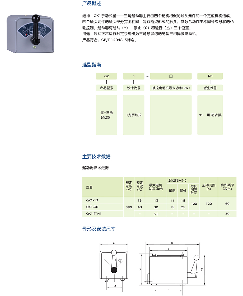 结构:QX1手动式星三角起动器主要由四个结构相似的触头元件和一个定位机构组成。四个触头元件的触头部分完全相同,是双断点形式的触头,其分合动作由不同外缘形状的凸轮控制。起动器有起动(Y)、停止(0)和运行(△)三个位置。用途:起动正常运行时定子绕组为三角形联结的笼型三相异步电动机。