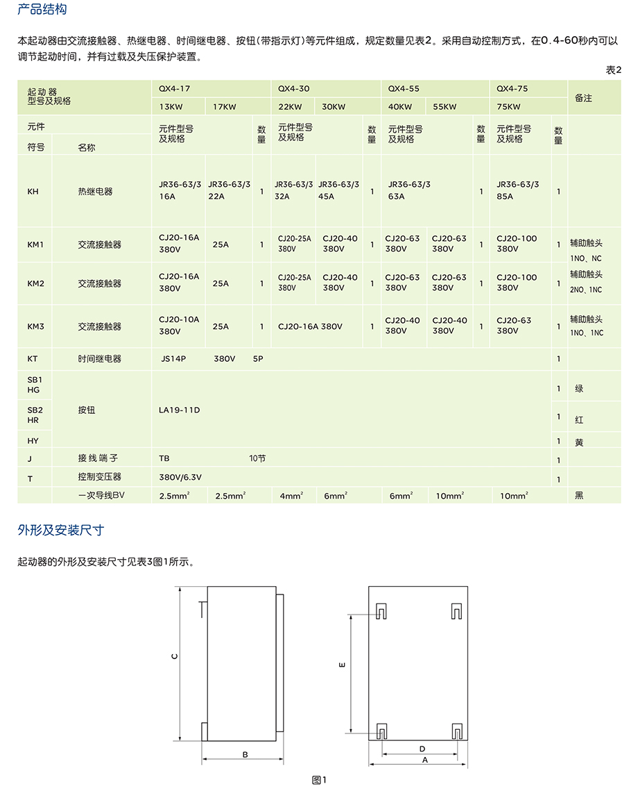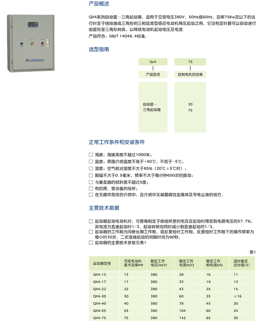 QX4系列自动星一三角起动器,适用于交流电压380V,50Hz或60Hz,功率75Kw及以下的运行时定子绕组接成三角形的三相鼠笼型感应电动机降压起动之用,它设有定时器可以自动进行由星形至三角形转换,以降低电动机起动电压及电流