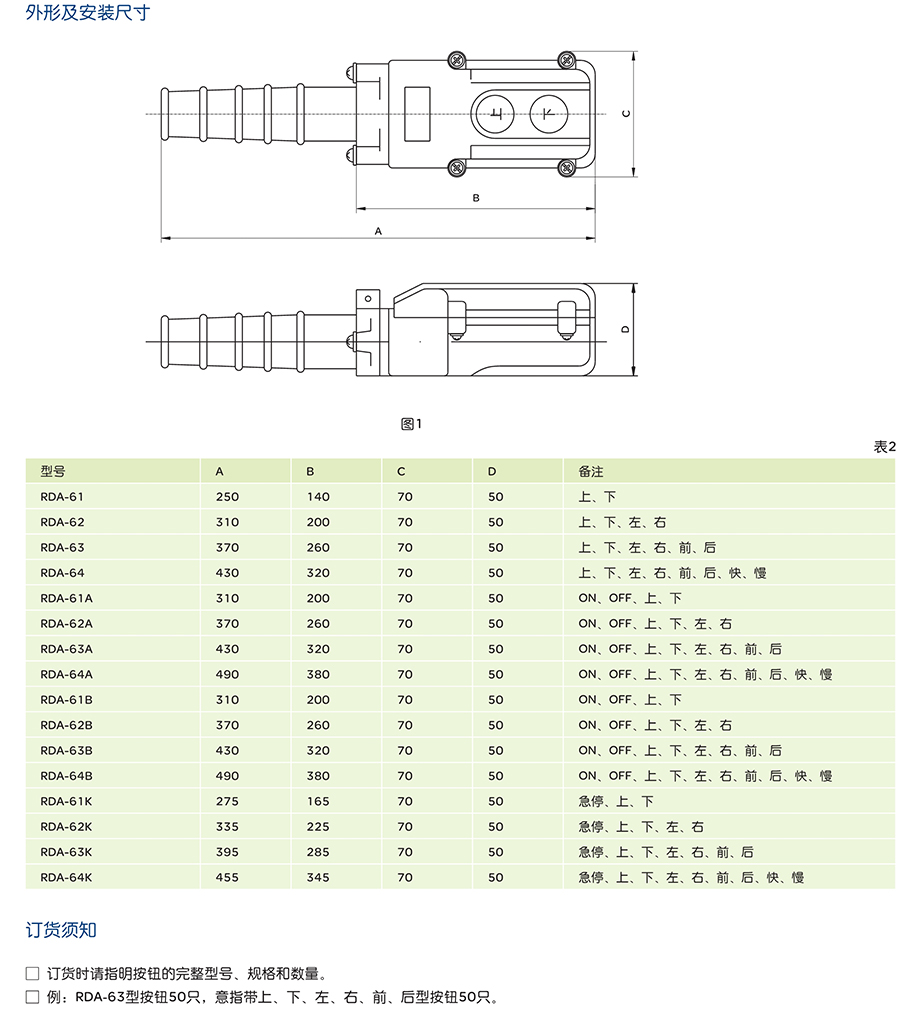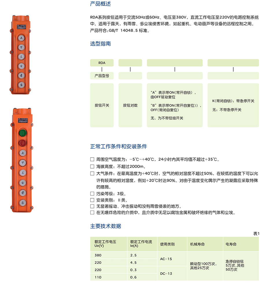 RDA系列按钮适用于交流50Hz或60Hz、电压至380V,直流工作电压至220V的电路控制系统中。适用于露天,有雨雪、多尘埃侵害环境,如起重机、电动葫芦等设备的远程控制之用。