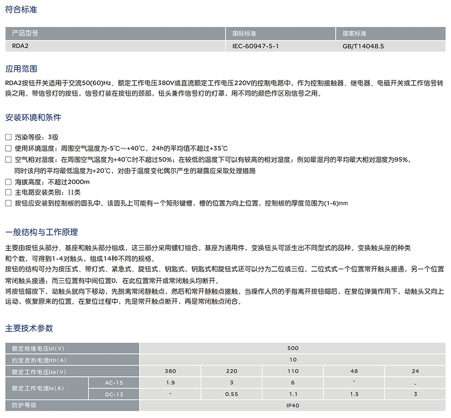 RDA2按钮开关适用于交流50(60)Hz、额定工作电压380V或直流额定工作电压220V的控制电路中,作为控制接触器、继电器、电磁开关或工作信号转换之用。带信号灯的按钮,信号灯装在按钮的颈部,钮头兼作信号灯的灯罩,用不同的颜色作区别信号之用。