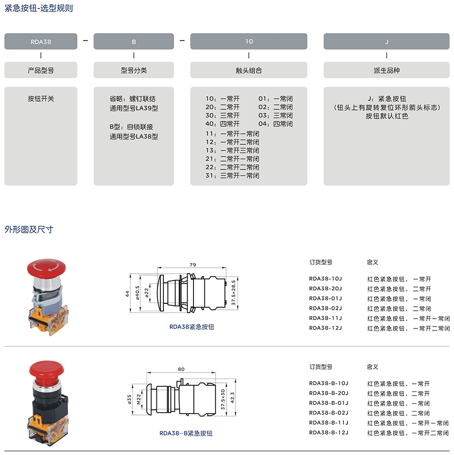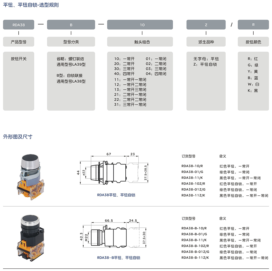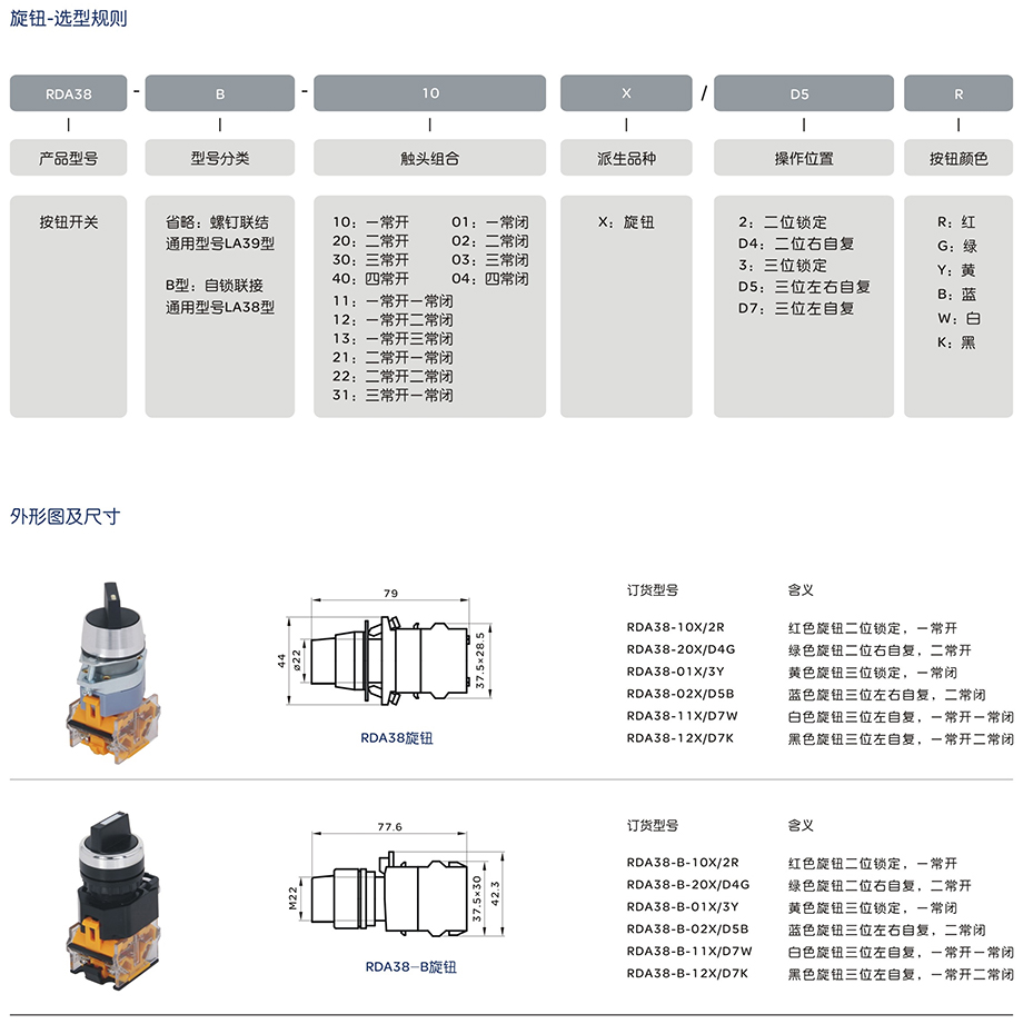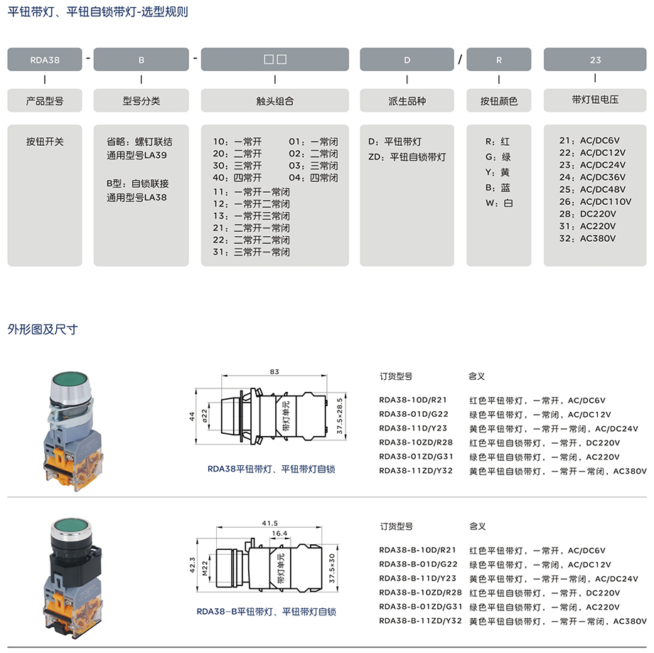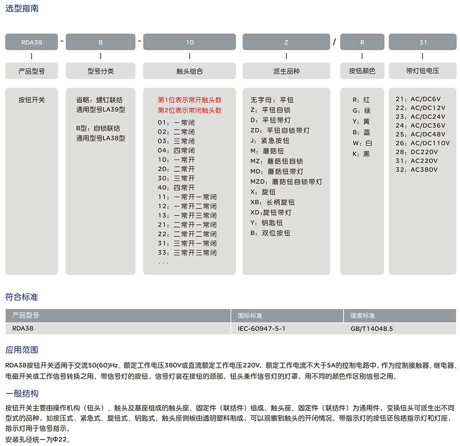 RDA38按钮开关适用于交流50(60)Hz、额定工作电压380V或直流额定工作电压220V,额定工作电流不大于5A的控制电路中,作为控制接触8器、继电器、电磁开关或工作信号转换之用。带信号灯的按钮,信号灯装在按钮的颈部,钮头兼作信号灯的灯罩,用不同的颜色作区别信号之用。