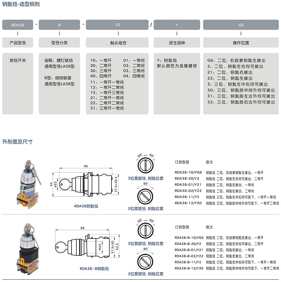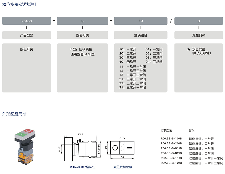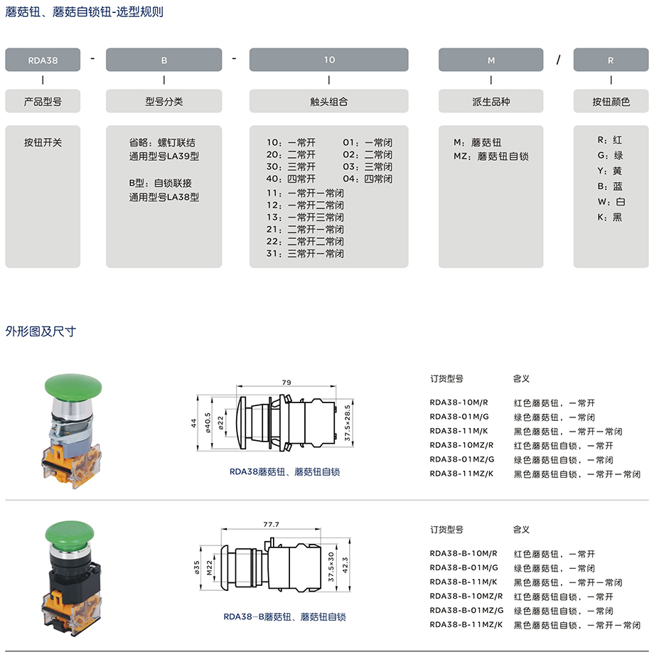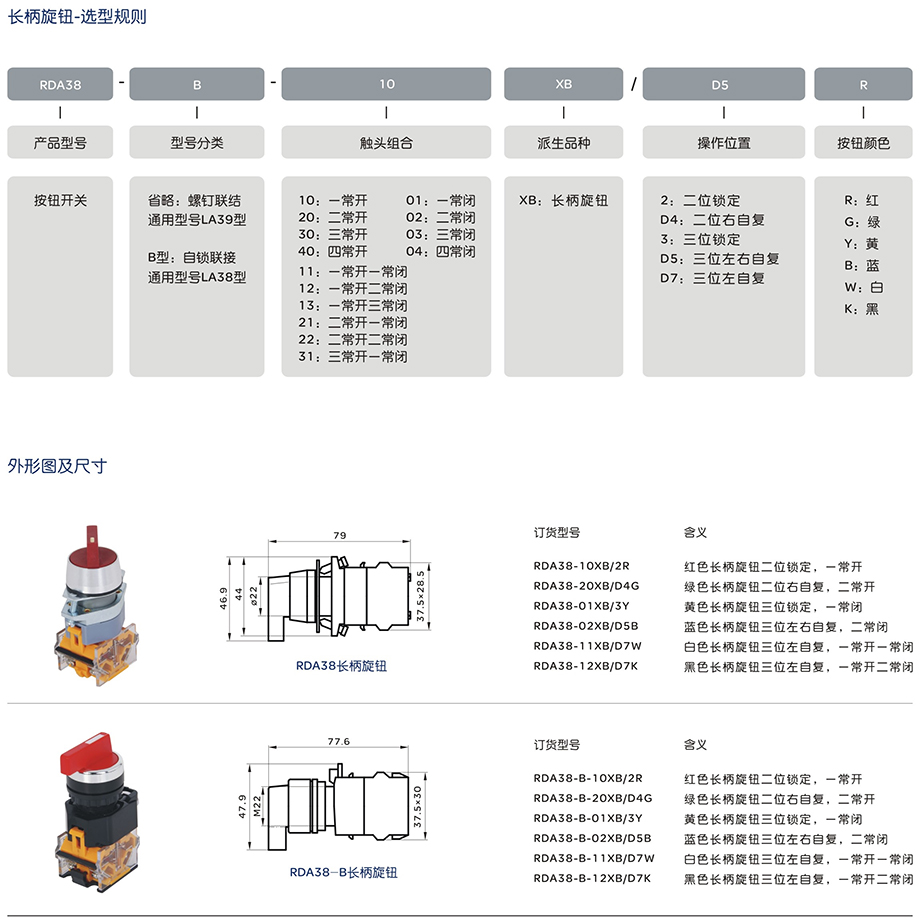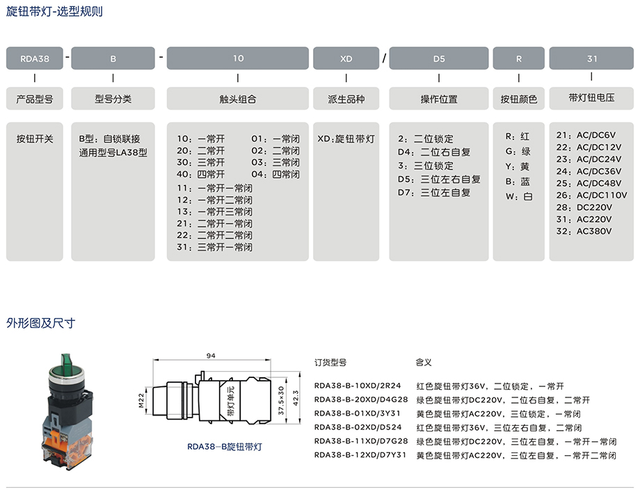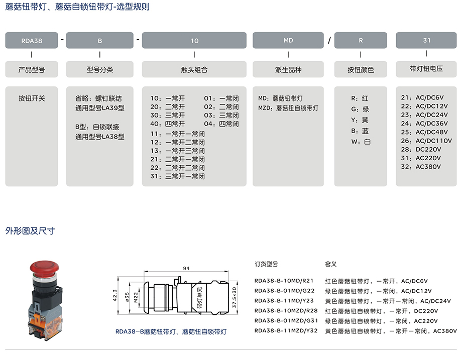 RDA38按钮开关适用于交流50(60)Hz、额定工作电压380V或直流额定工作电压220V,额定工作电流不大于5A的控制电路中,作为控制接触8器、继电器、电磁开关或工作信号转换之用。带信号灯的按钮,信号灯装在按钮的颈部,钮头兼作信号灯的灯罩,用不同的颜色作区别信号之用。
