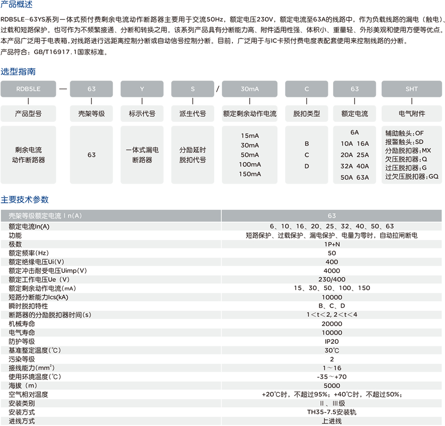 RDB5LE-63YS系列一体式预付费剩余电流动作断路器主要用于交流50Hz,额定电压230V,额定电流至63A的线路中,作为负载线路的漏电(触电)、过载和短路保护。也可作为不频繁接通、分断和转换之用。该系列产品具有分断能力高、附件适用性强、体积小、重量轻、外形美观和使用方便等优点。