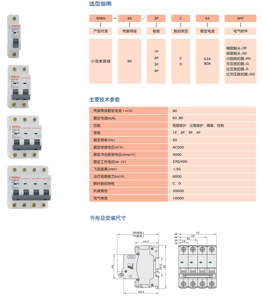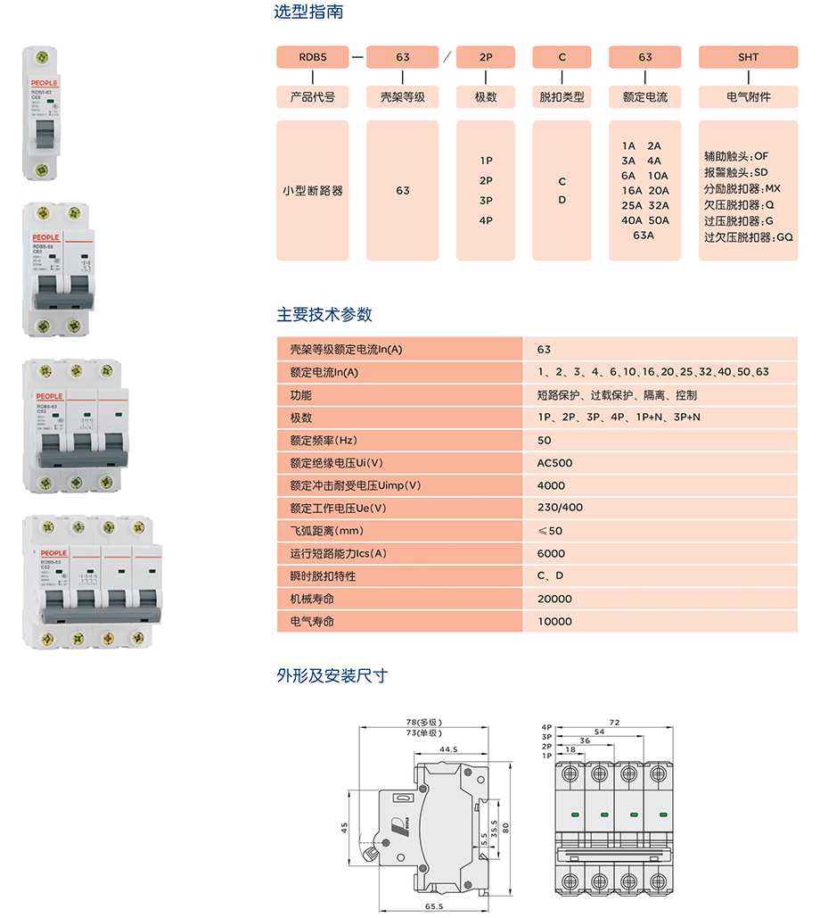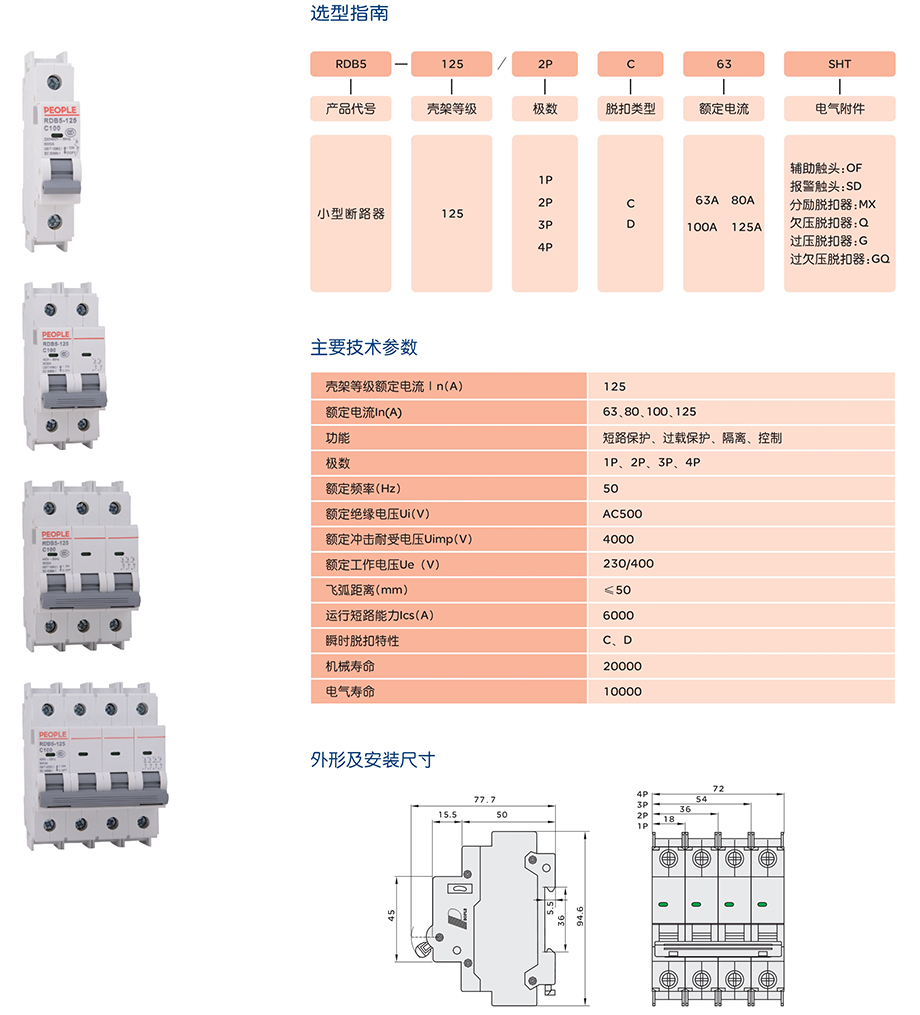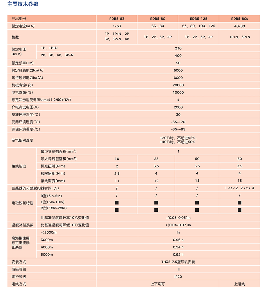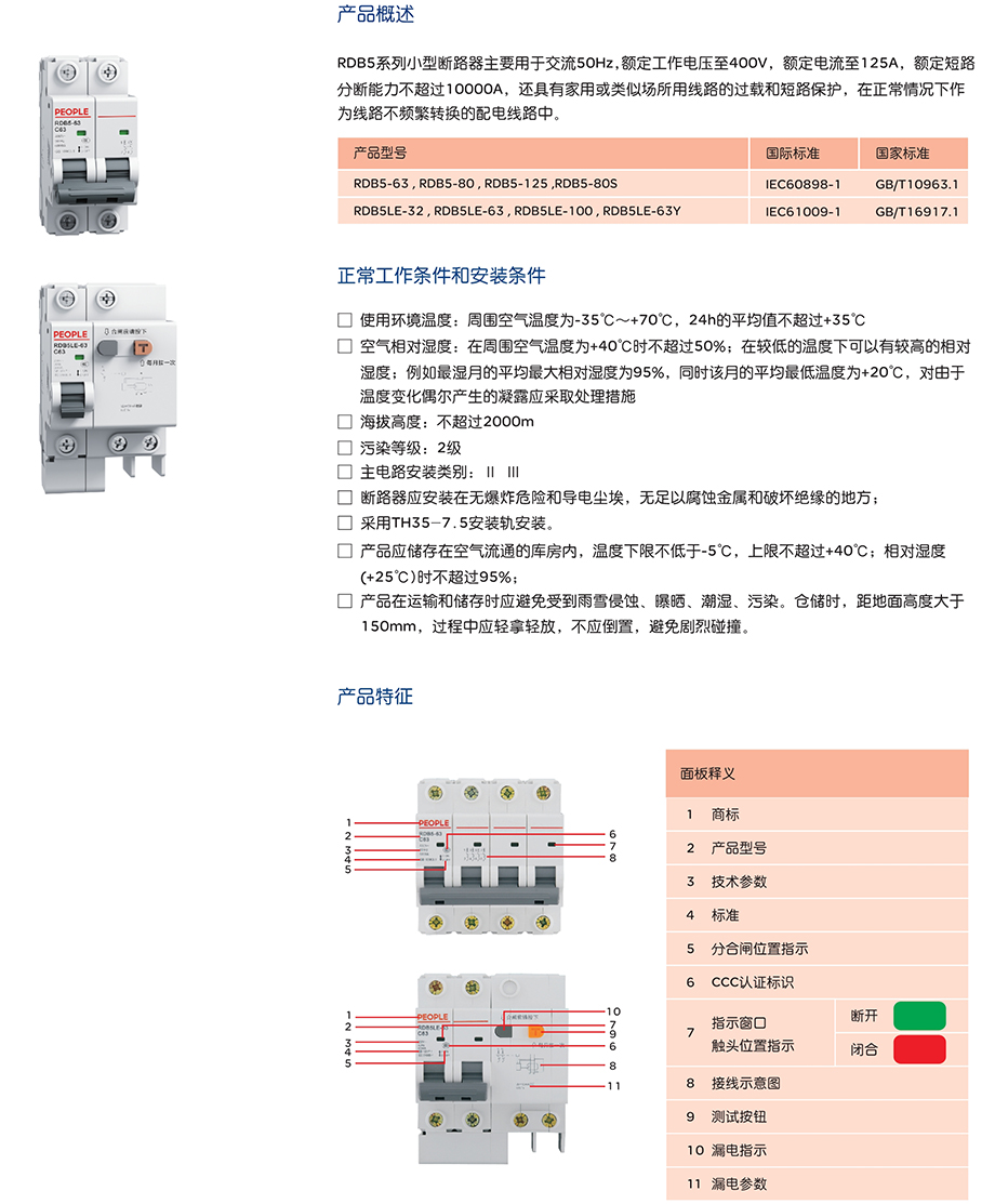 RDB5系列小型断路器主要用于交流50Hz,额定工作电压至400V,额定电流至125A,额定短路分断能力不超过10000A,还具有家用或类似场所用线路的过载和短路保护,在正常情况下作为线路不频繁转换的配电线路中。