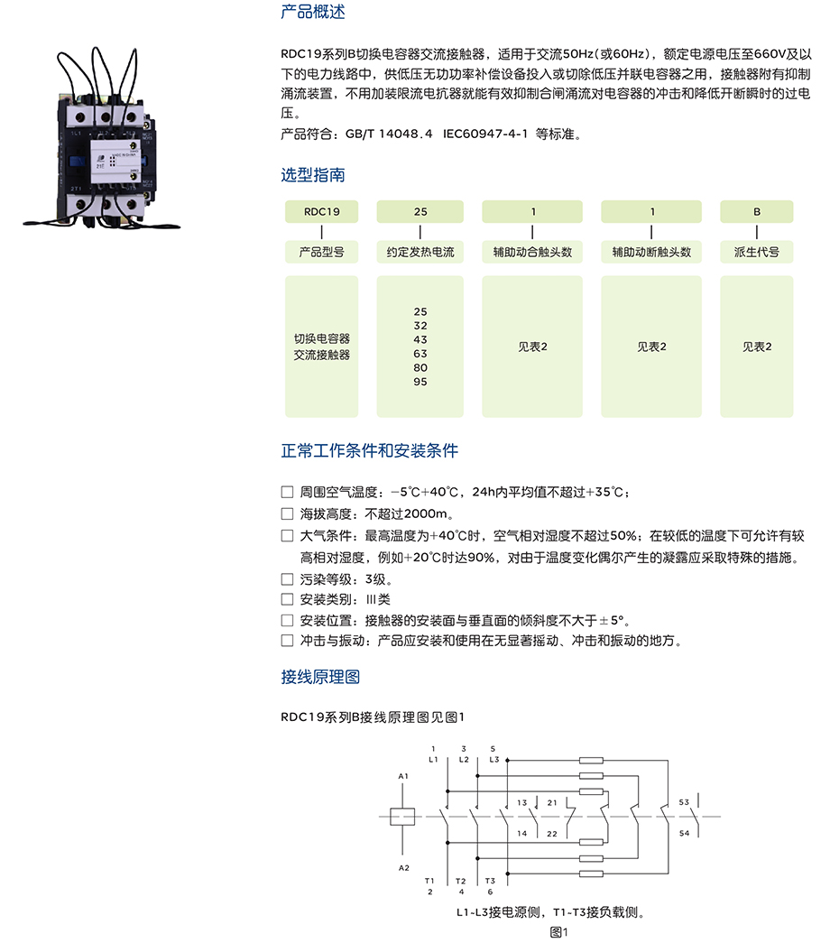 RDC19系列B切换电容器交流接触器,适用于交流50Hz(或60Hz),额定电源电压至660V及以下的电力线路中,供低压无功功率补偿设备投入或切除低压并联电容器之用,接触器附有抑制涌流装置,不用加装限流电抗器就能有效抑制合闸涌流对电容器的冲击和降低开断瞬时的过电压。