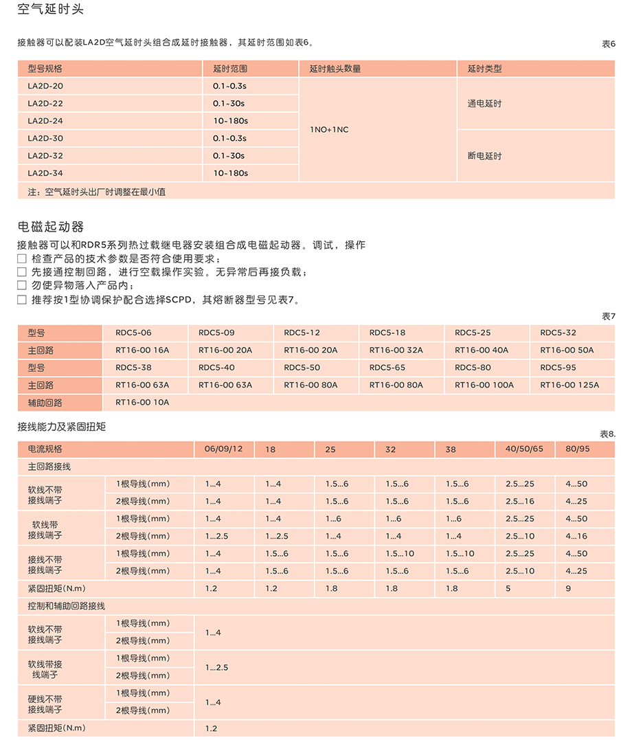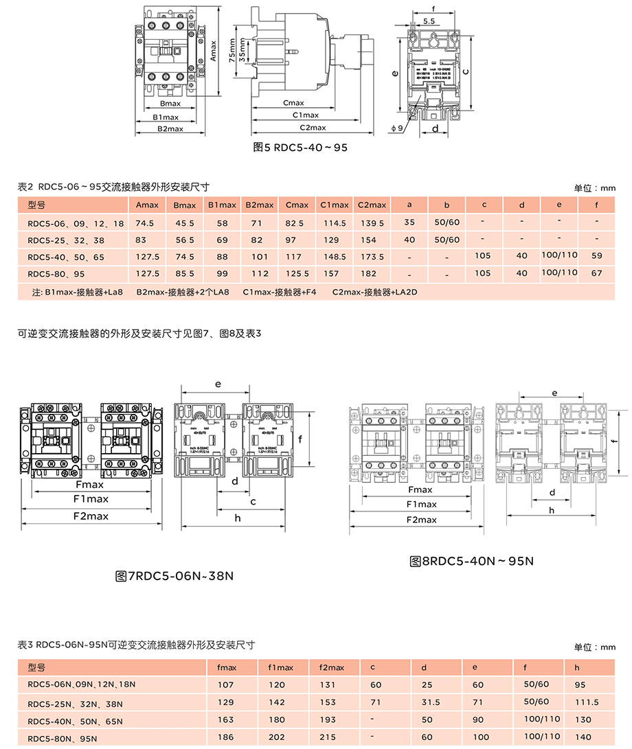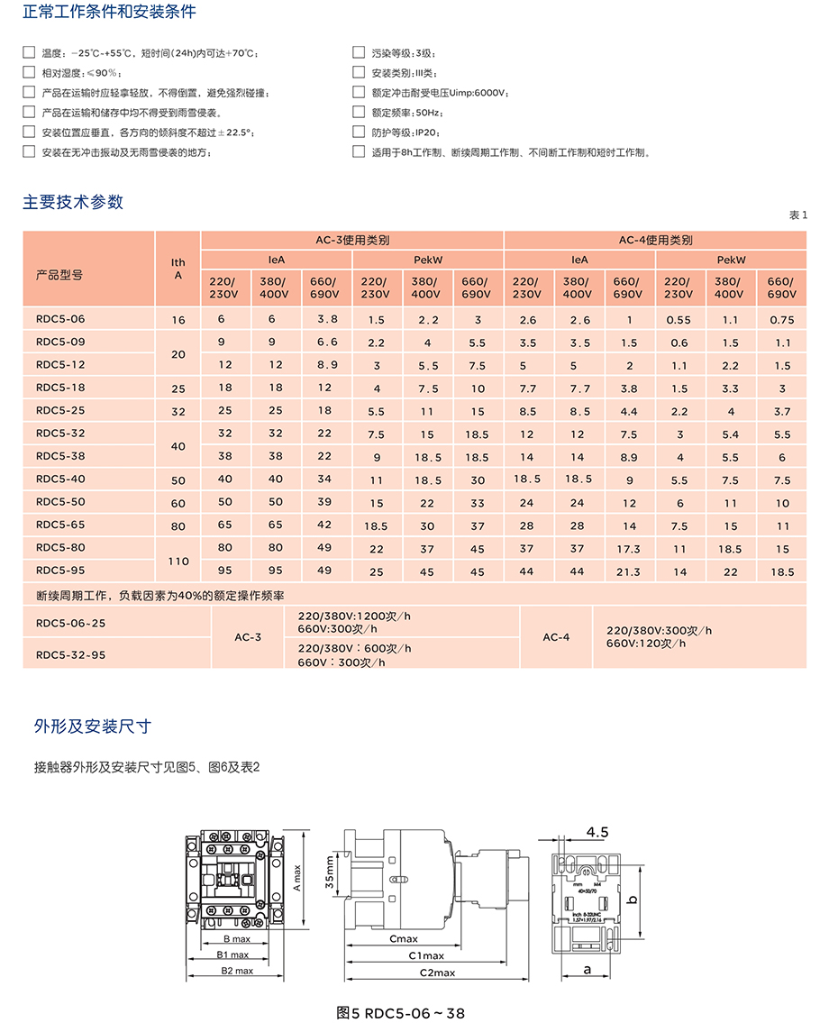 RDC5系列交流接触器主要用于交流50HZ,额定工作电压至690V,额定工作电流至95A的电路中,供远距离接通与分断电路之用,并可与热继电器直接插接组成电磁起动器,以保护可能发生操作过负荷的电路。接触器还可组装积木式辅助触头组、空气延时头、机械连锁机构等附件,组成延时接触器、可逆接触器、星三角起动器。