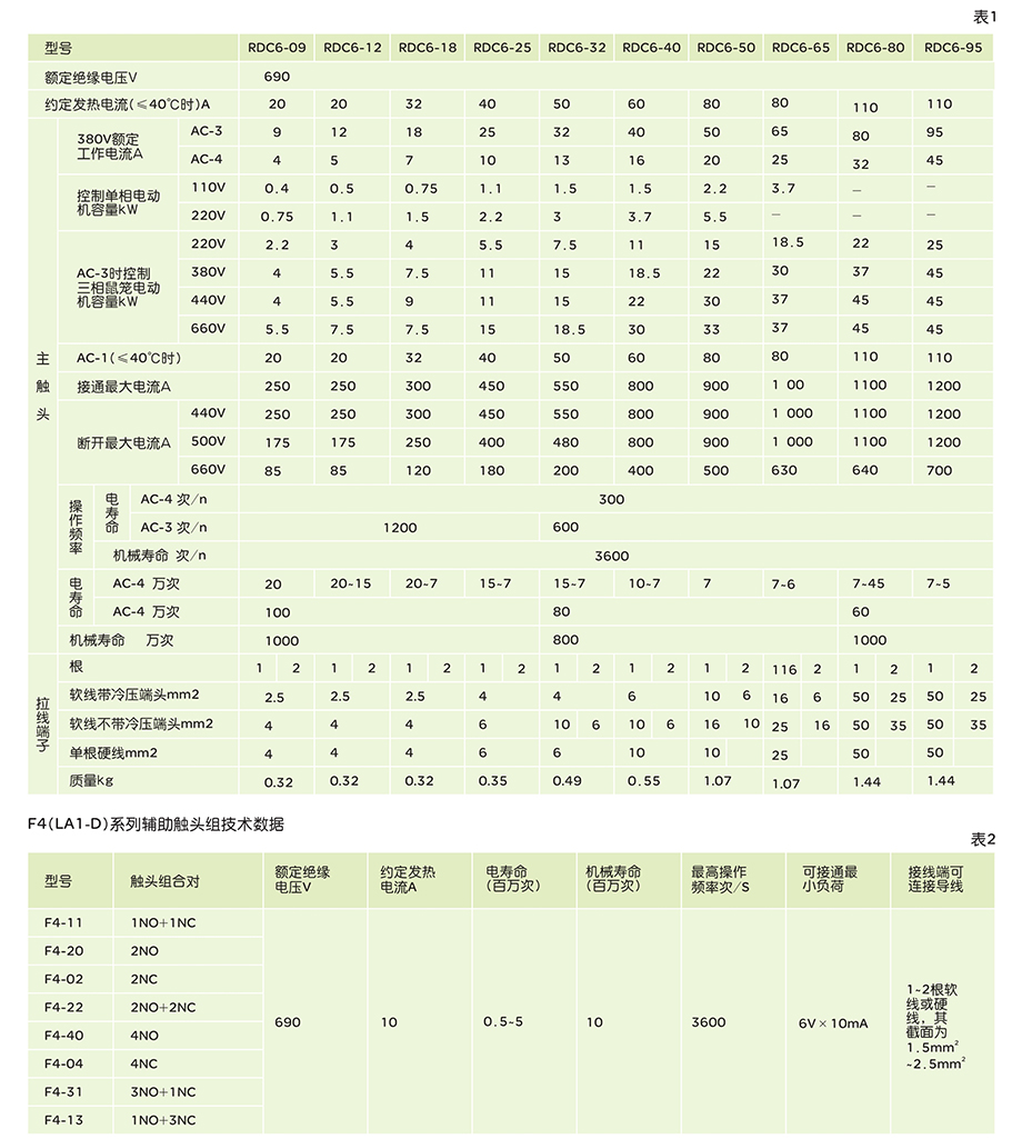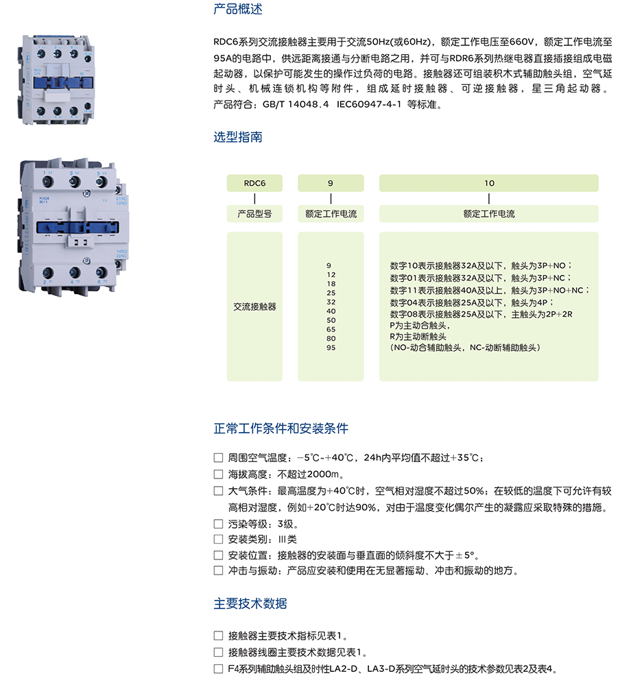 RDC6系列交流接触器主要用于交流50Hz(或60Hz),额定工作电压至660V,额定工作电流至95A的电路中,供远距离接通与分断电路之用,并可与RDR6系列热继电器直接插接组成电磁起动器,以保护可能发生的操作过负荷的电路。接触器还可组装积木式辅助触头组,空气延时头、机械连锁机构等附件,组成延时接触器、可逆接触器,星三角起动器。
