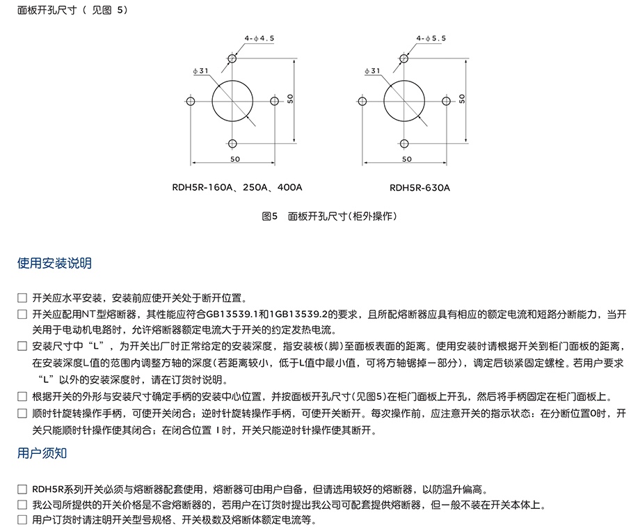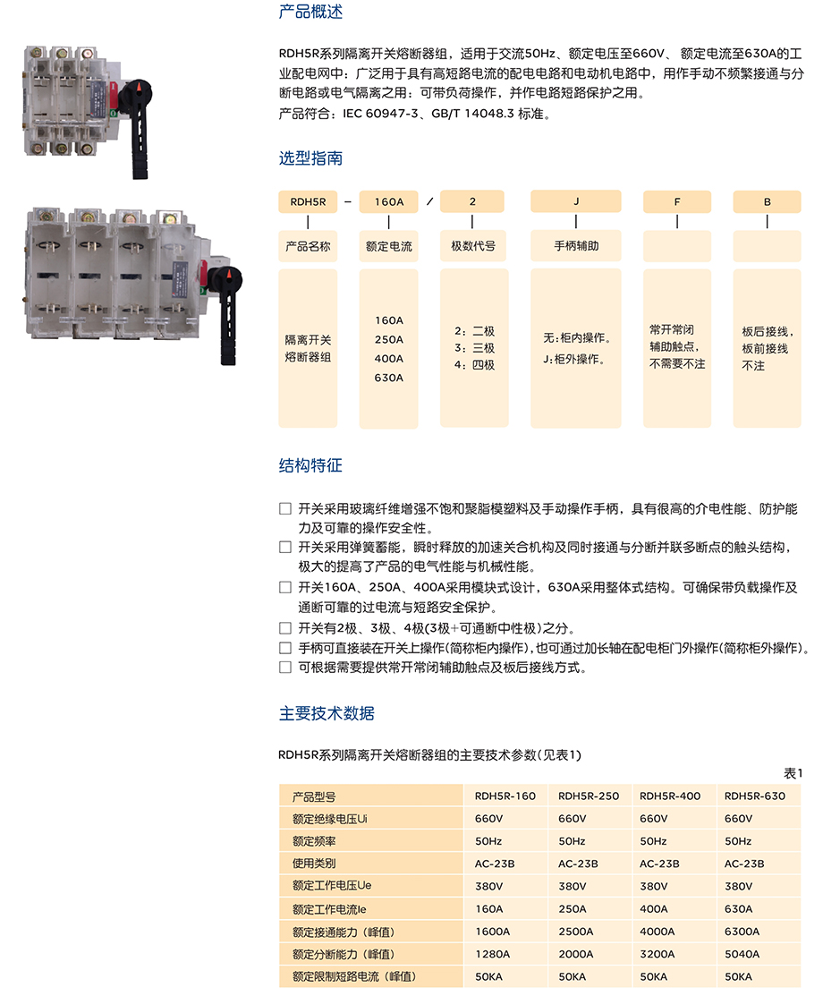 RDH5R系列隔离开关熔断器组,适用于交流50Hz、额定电压至660V、额定电流至630A的工业配电网中:广泛用于具有高短路电流的配电电路和电动机电路中,用作手动不频繁接通与分断电路或电气隔离之用:可带负荷操作,并作电路短路保护之用。