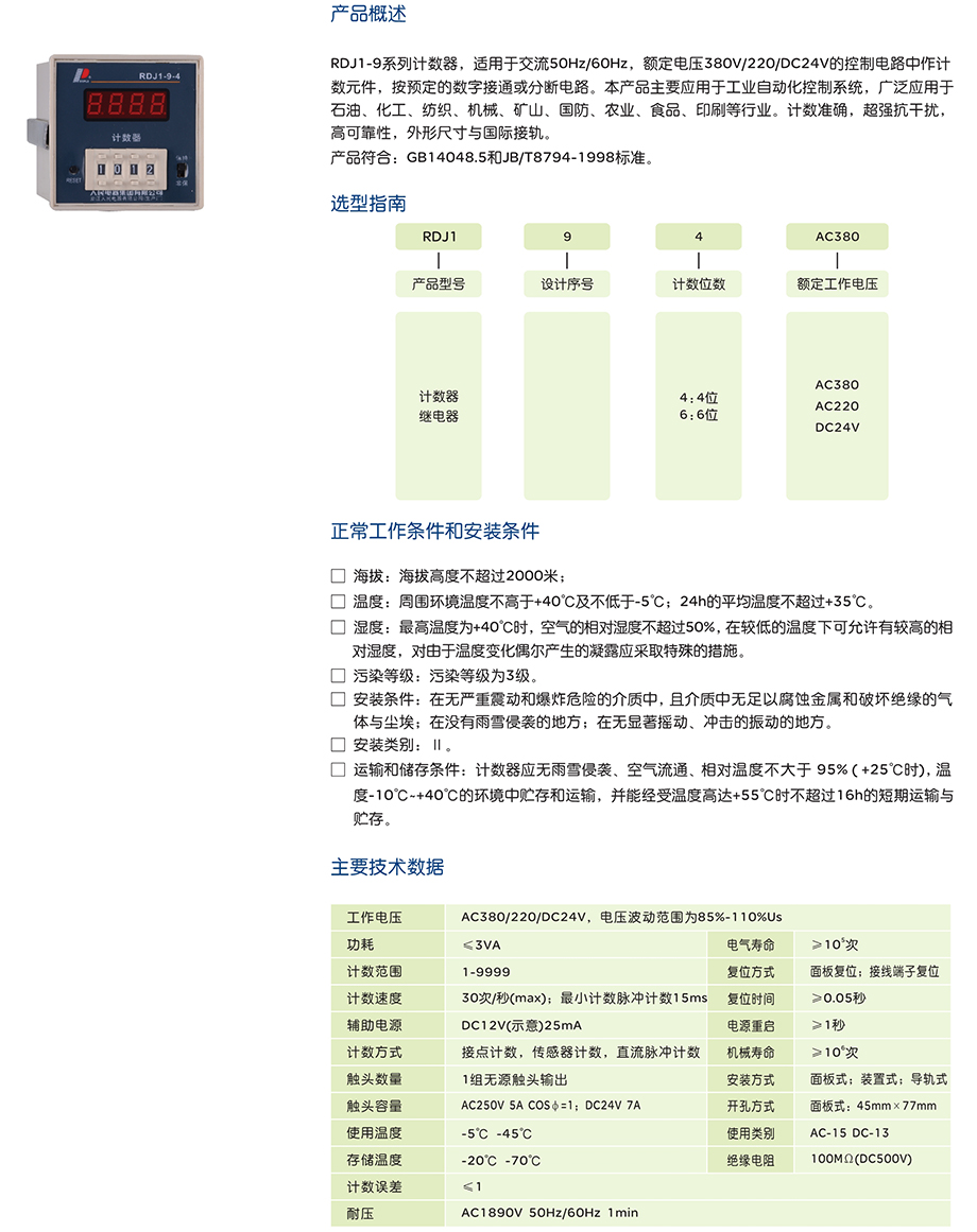RDJ1-9系列计数器,适用于交流50Hz/60Hz,额定电压380V/220/DC24V的控制电路中作计数元件,按预定的数字接通或分断电路。本产品主要应用于工业自动化控制系统,广泛应用于石油、化工、纺织、机械、矿山、国防、农业、食品、印刷等行业。计数准确,抗干扰,高可靠性。
