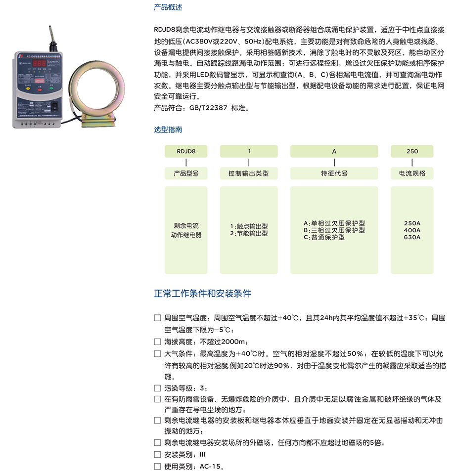 剩余电流动作继电器RDJD8-2A/250A(节能型)