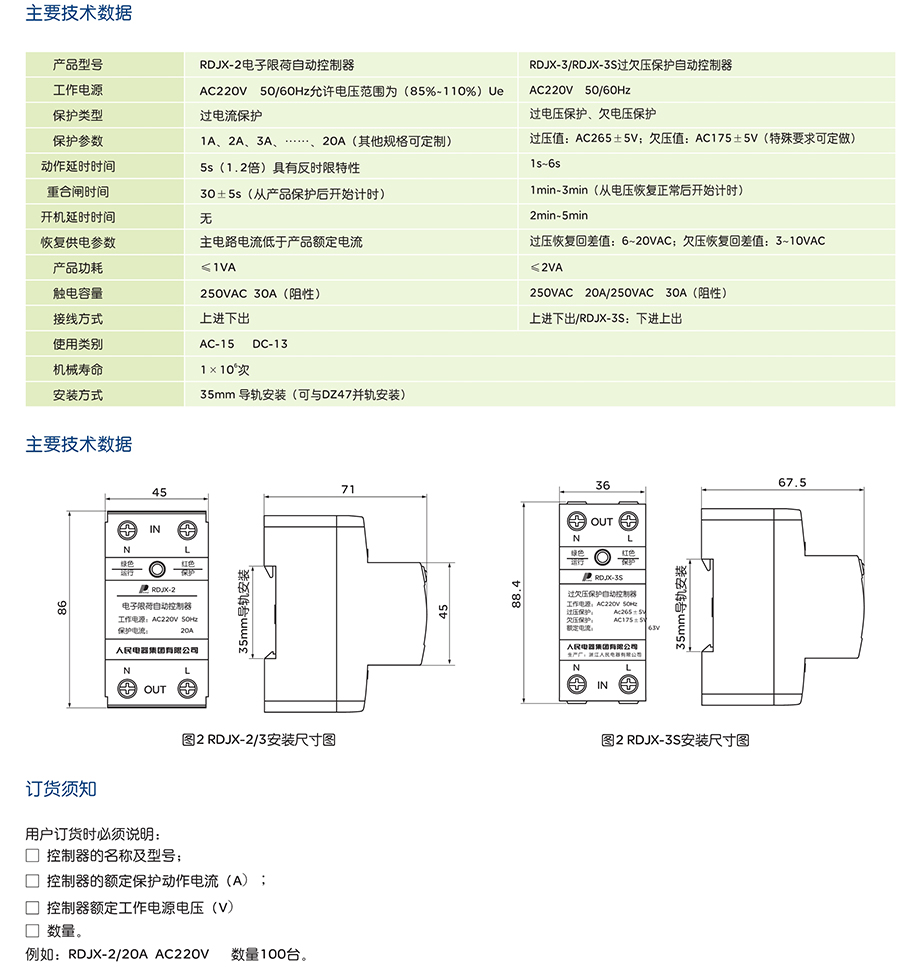 RDJX系列单相交流保护自动控制器(分为电子限荷自动控制器、过欠压保护自动控制器等)主要用于交流50/60Hz,额定电压220V级别的各种故障检测,对单相输入电源的电压过高,电压过低或对所带负载容量过大等提供继电保护,并在电压、电流恢复正常后自动合闸供电。产品广泛应用于各种需要限电的公寓、宿舍,各种用电设备的电源监视等,是家用电器及工业设备运行中维护设备工作电压和负载正常的保护产品。