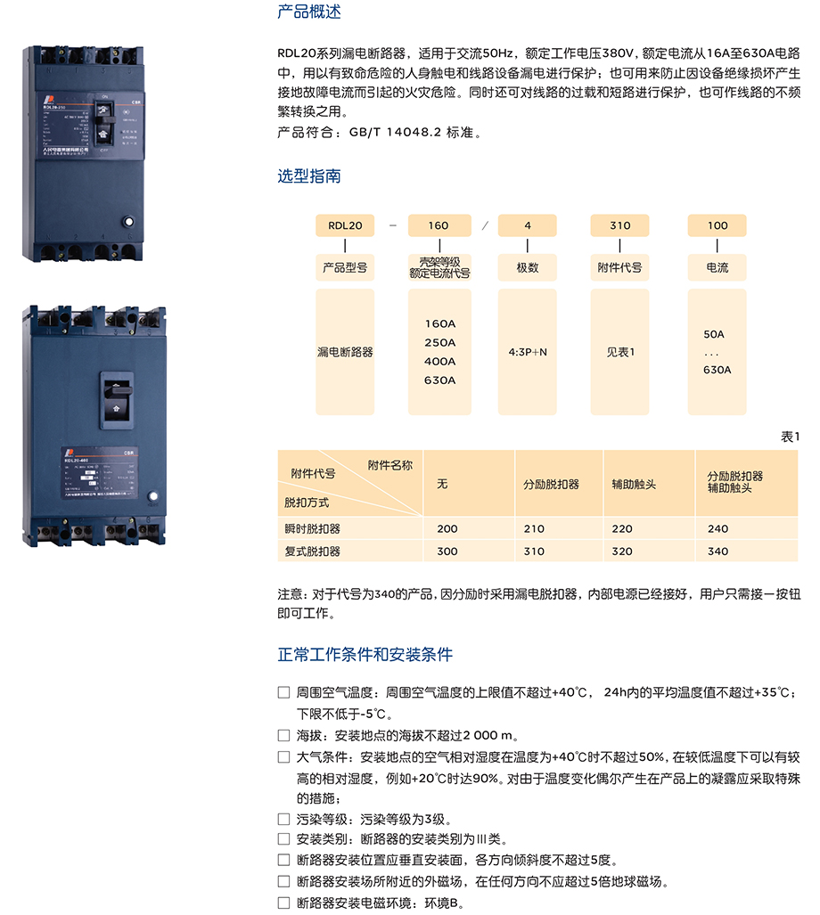 RDL20系列漏电断路器,适用于交流50Hz,额定工作电压380V,额定电流从16A至630A电路中,用以有致命危险的人身触电和线路设备漏电进行保护;也可用来防止因设备绝缘损坏产生接地故障电流而引起的火灾危险。同时还可对线路的过载和短路进行保护,也可作线路的不频繁转换之用。