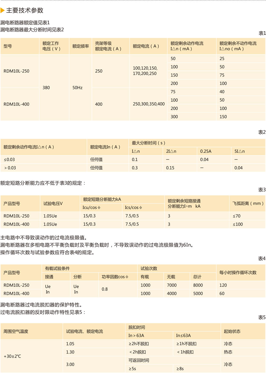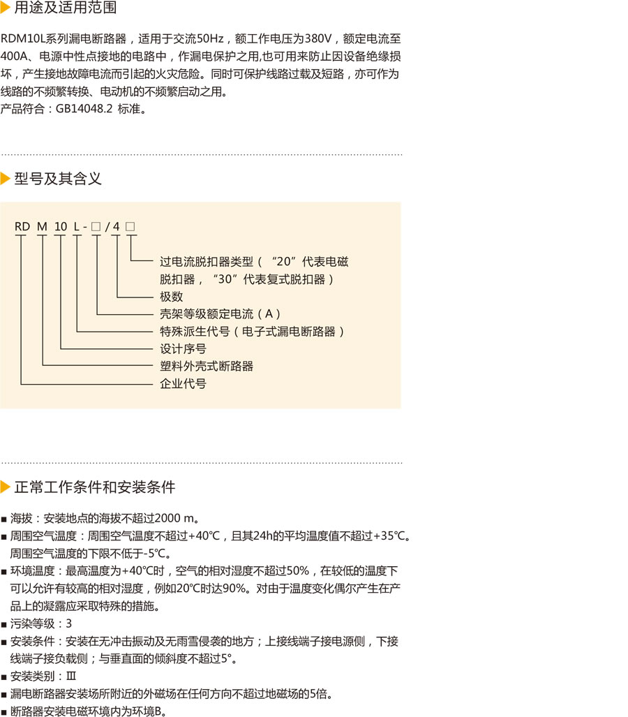 RDM10L系列漏电断路器,适用于交流50Hz,额工作电压为380V,额定电流至400A、电源中性点接地的电路中,作漏电保护之用,也可用来防止因设备绝缘损坏,产生接地故障电流而引起的火灾危险。同时可保护线路过载及短路,亦可作为线路的不频繁转换、电动机的不频繁启动之用。