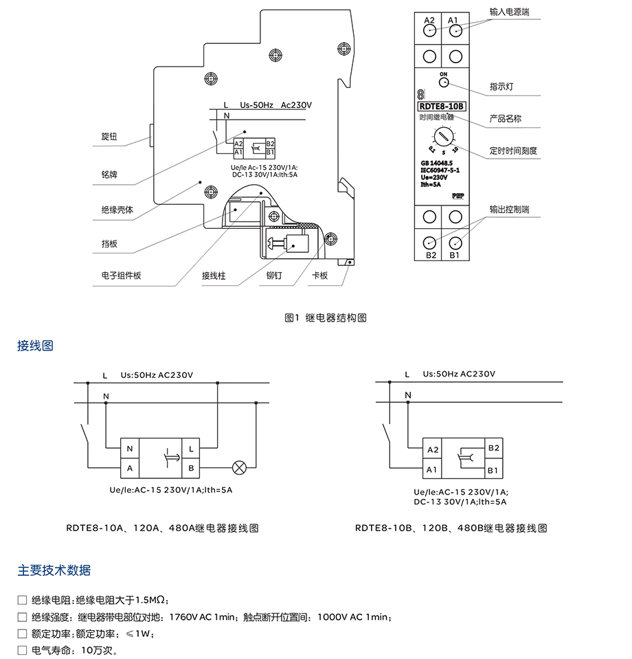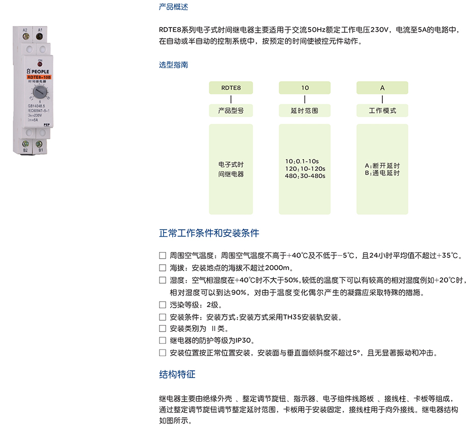 RDTE8系列电子式时间继电器主要适用于交流50Hz额定工作电压230V,电流至5A的电路中,在自动或半自动的控制系统中,按预定的时间使被控元件动作。