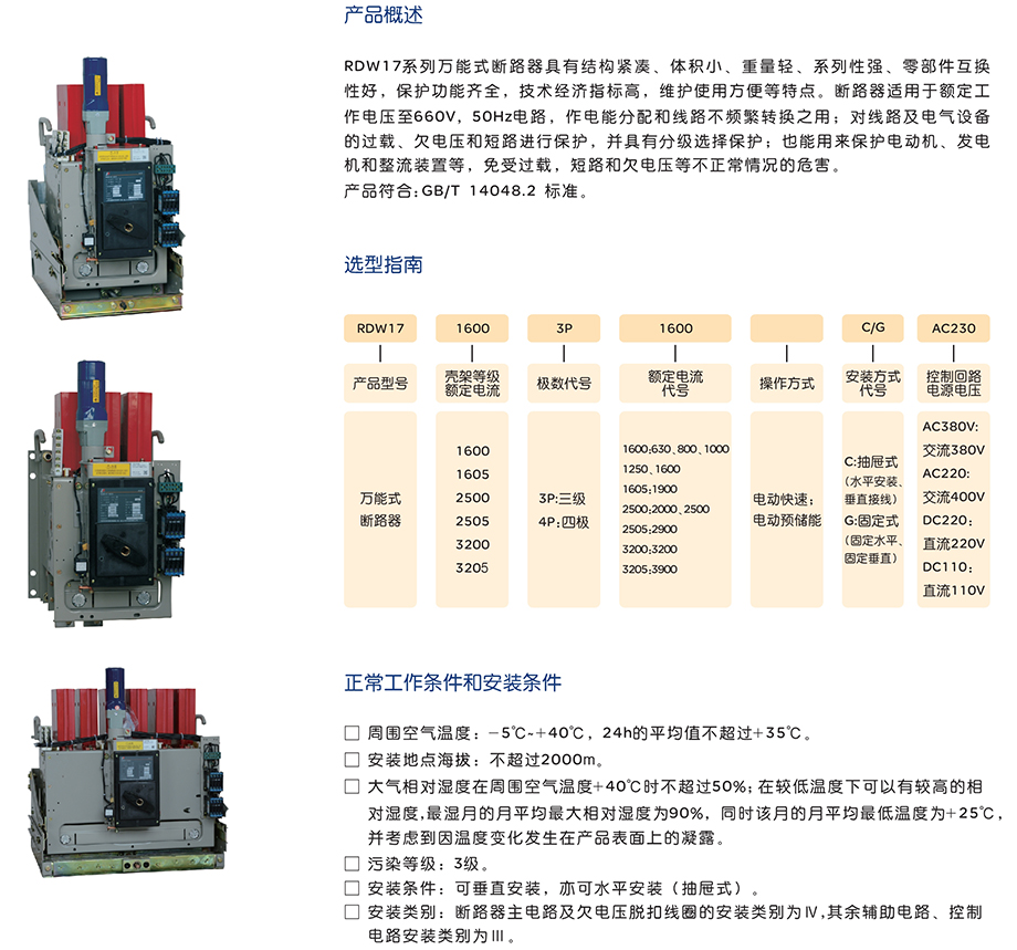 RDW17系列万能式断路器具有结构紧凑、体积小、重量轻、系列性强、零部件互换