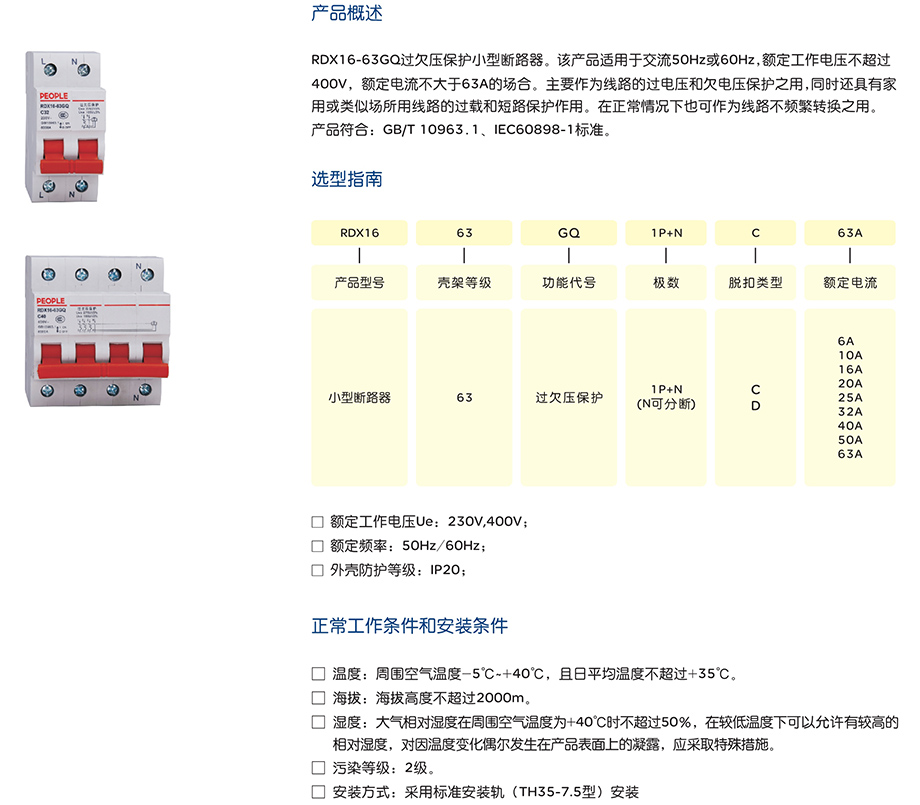 小型过欠压断路器RDX16-63GQ C20 1P+N