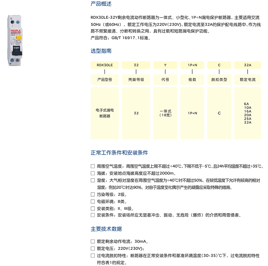 5. 中国人民电器 RDX30LE-32Y 系列剩余电流动作断路器
