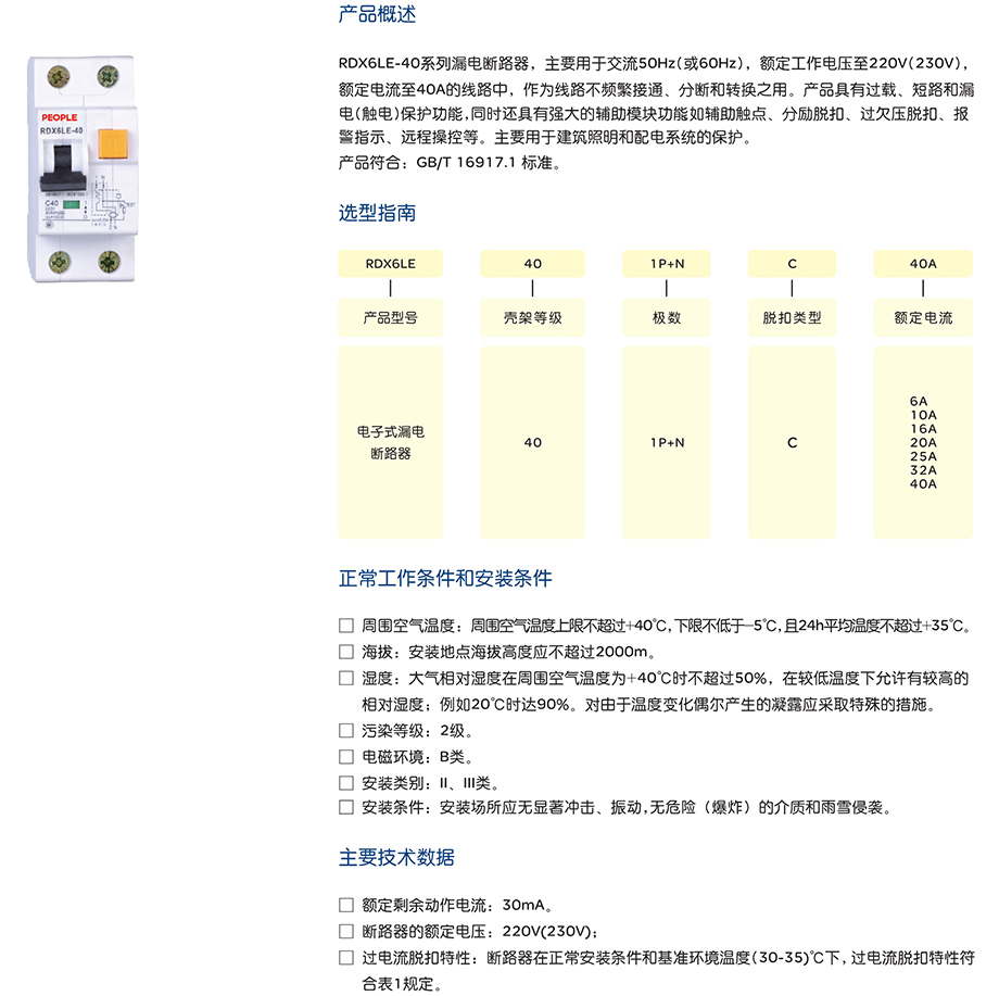 RDX6LE-40系列漏电断路器,主要用于交流50Hz(或60Hz),额定工作电压至220V(230V),额定电流至40A的线路中,作为线路不频繁接通、分断和转换之用。产品具有过载、短路和漏电(触电)保护功能,同时还具有强大的辅助模块功能如辅助触点、分励脱扣、过欠压脱扣、报警指示、远程操控等。主要用于建筑照明和配电系统的保护。