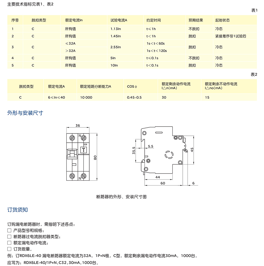 小型漏电断路器RDX6LE-40 C40 1P+N